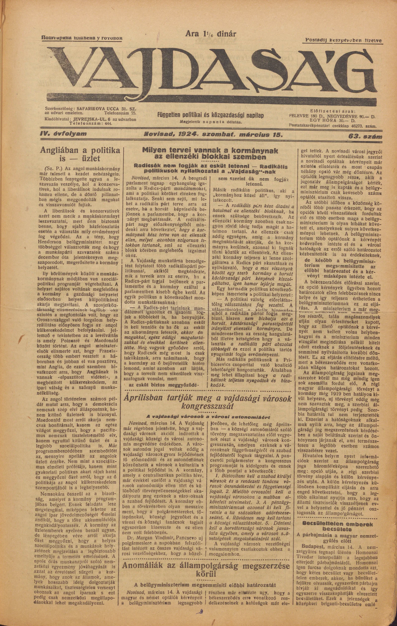 Vajdaság, 4. évf. 1924. március 15. 63. sz.
