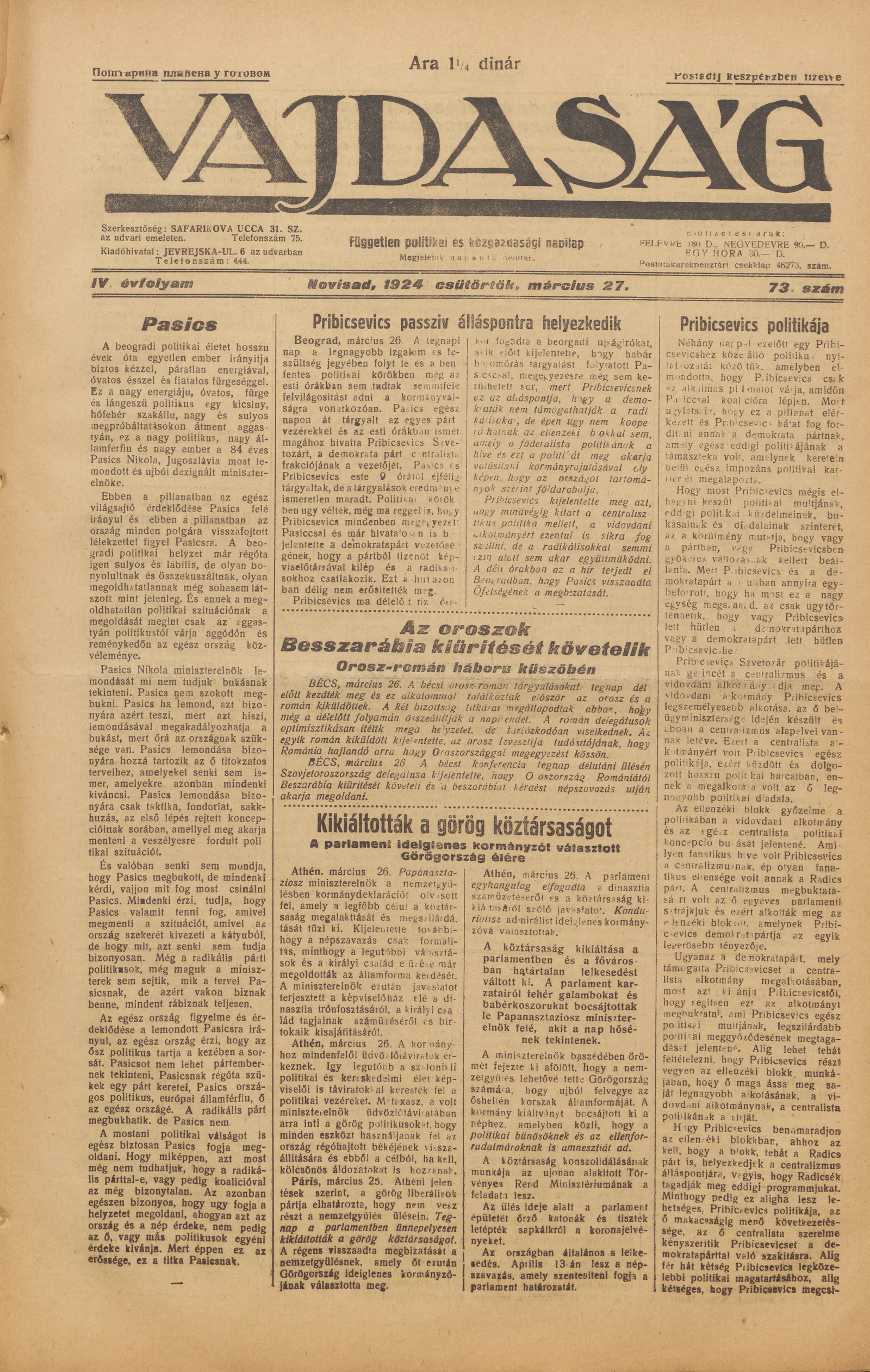 Vajdaság, 4. évf. 1924. március 27. 73. sz.