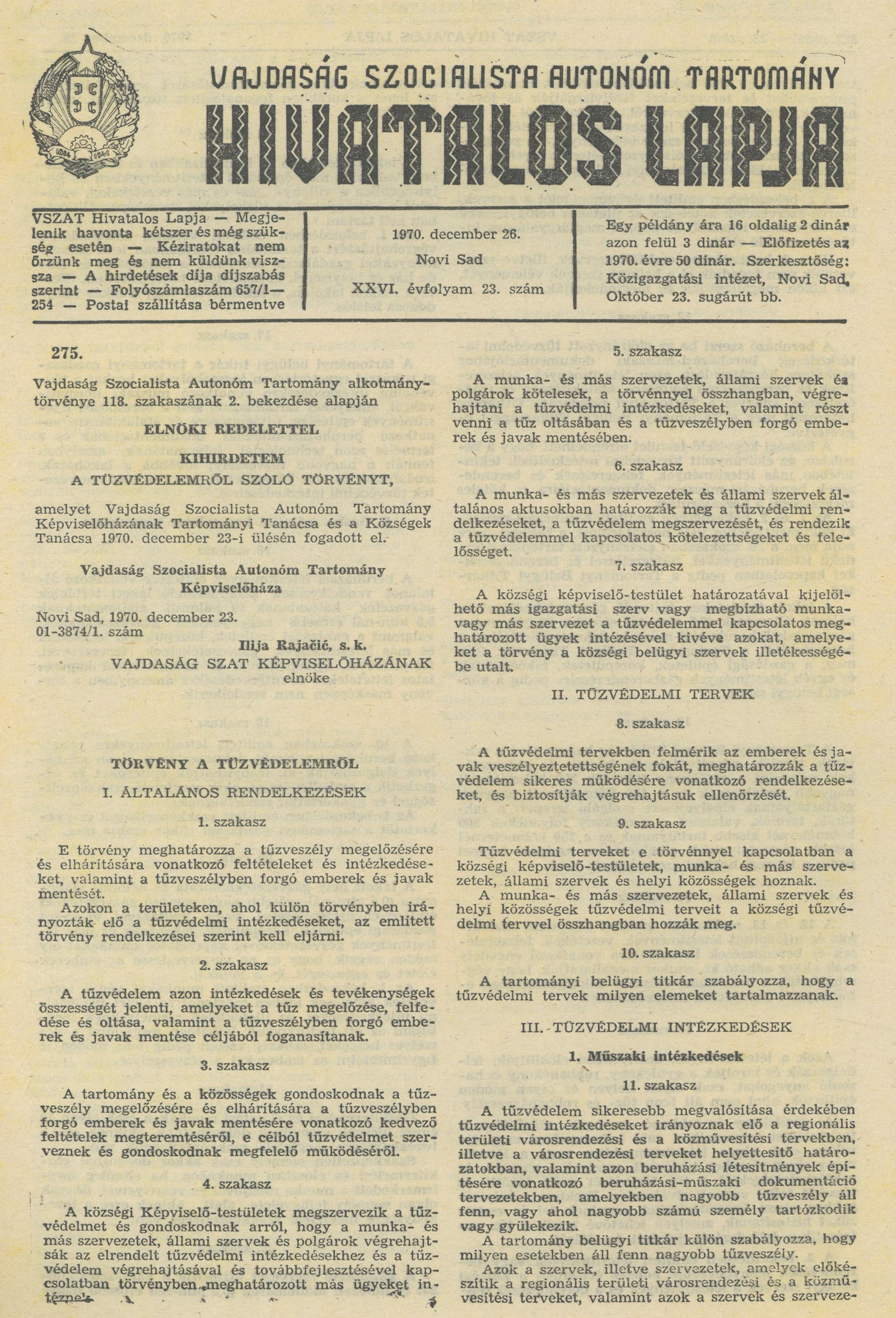 Vajdaság Szocialista Autonóm Tartomány Hivatalos Lapja, 26. évf. 1970. december 26. 23. sz. 321–332. oldal