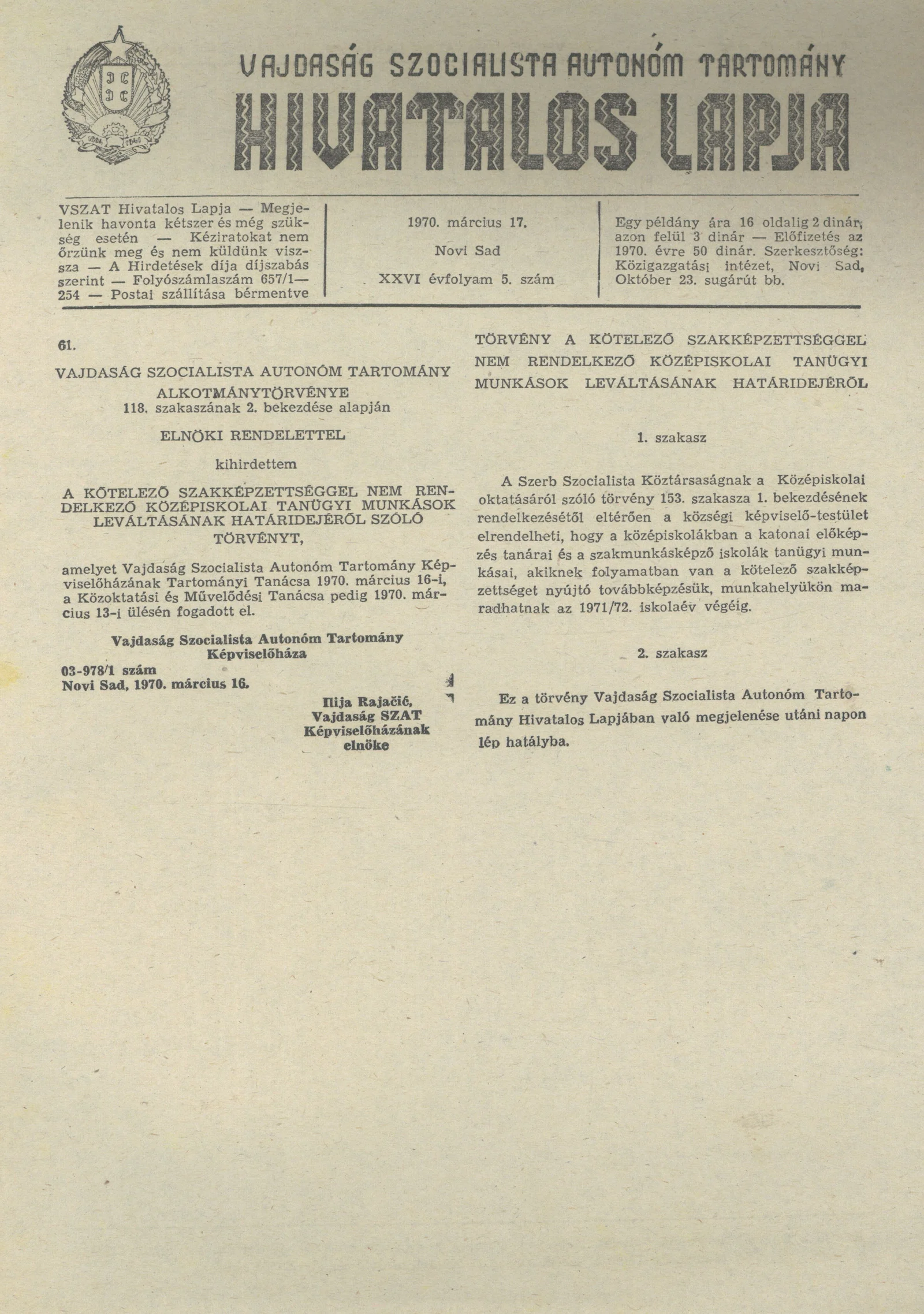 Vajdaság Szocialista Autonóm Tartomány Hivatalos Lapja, 26. évf. 1970. március 17. 5. sz. 65–66. oldal