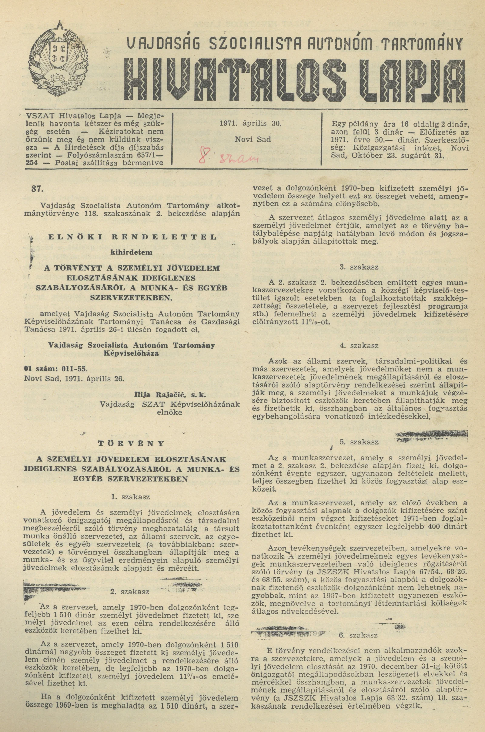 Vajdaság Szocialista Autonóm Tartomány Hivatalos Lapja, 27. évf. 1971. április 30. 8. sz. 133–140. oldal