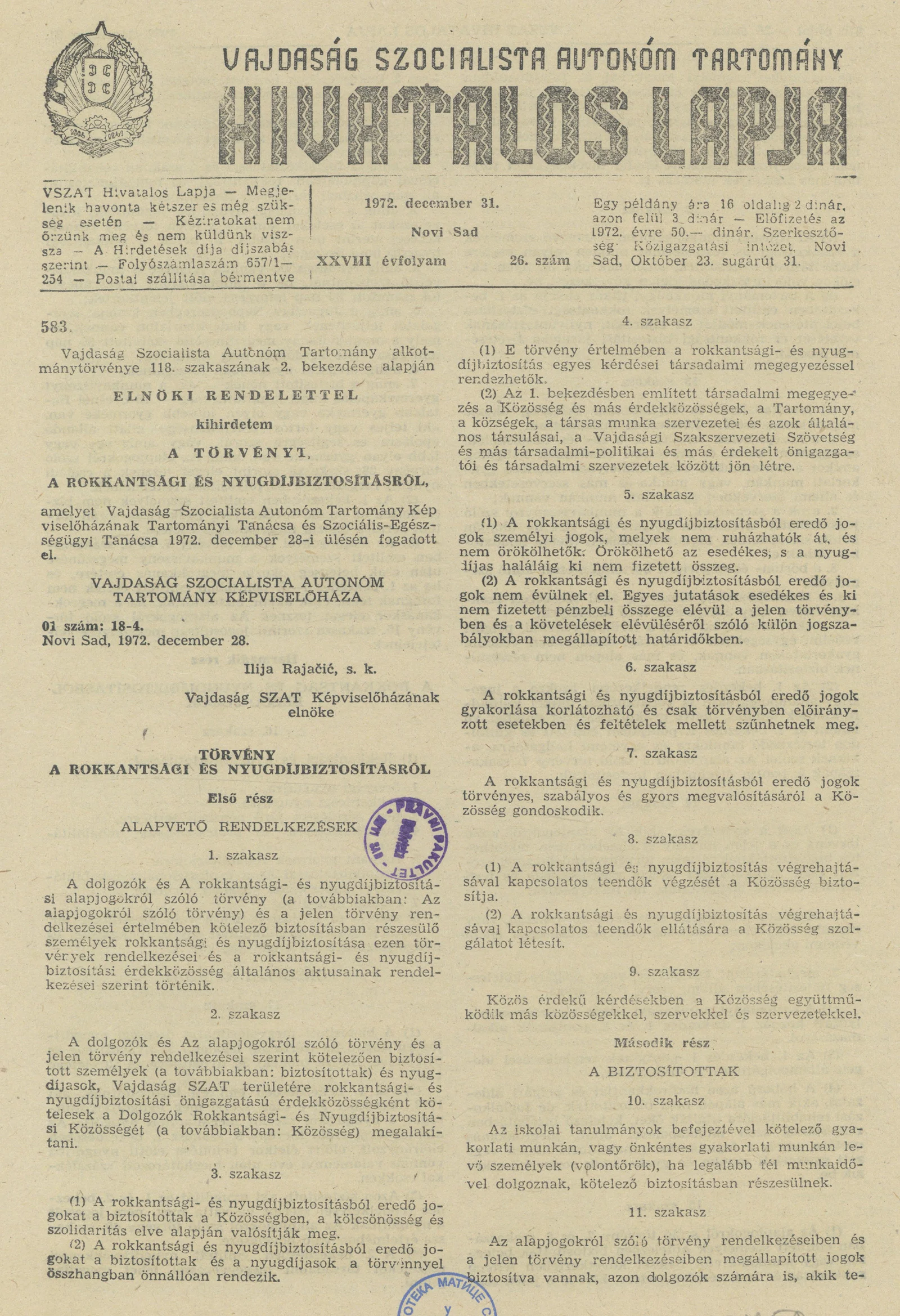 Vajdaság Szocialista Autonóm Tartomány Hivatalos Lapja, 28. évf. 1972. december 31. 26. sz. 869–924. oldal