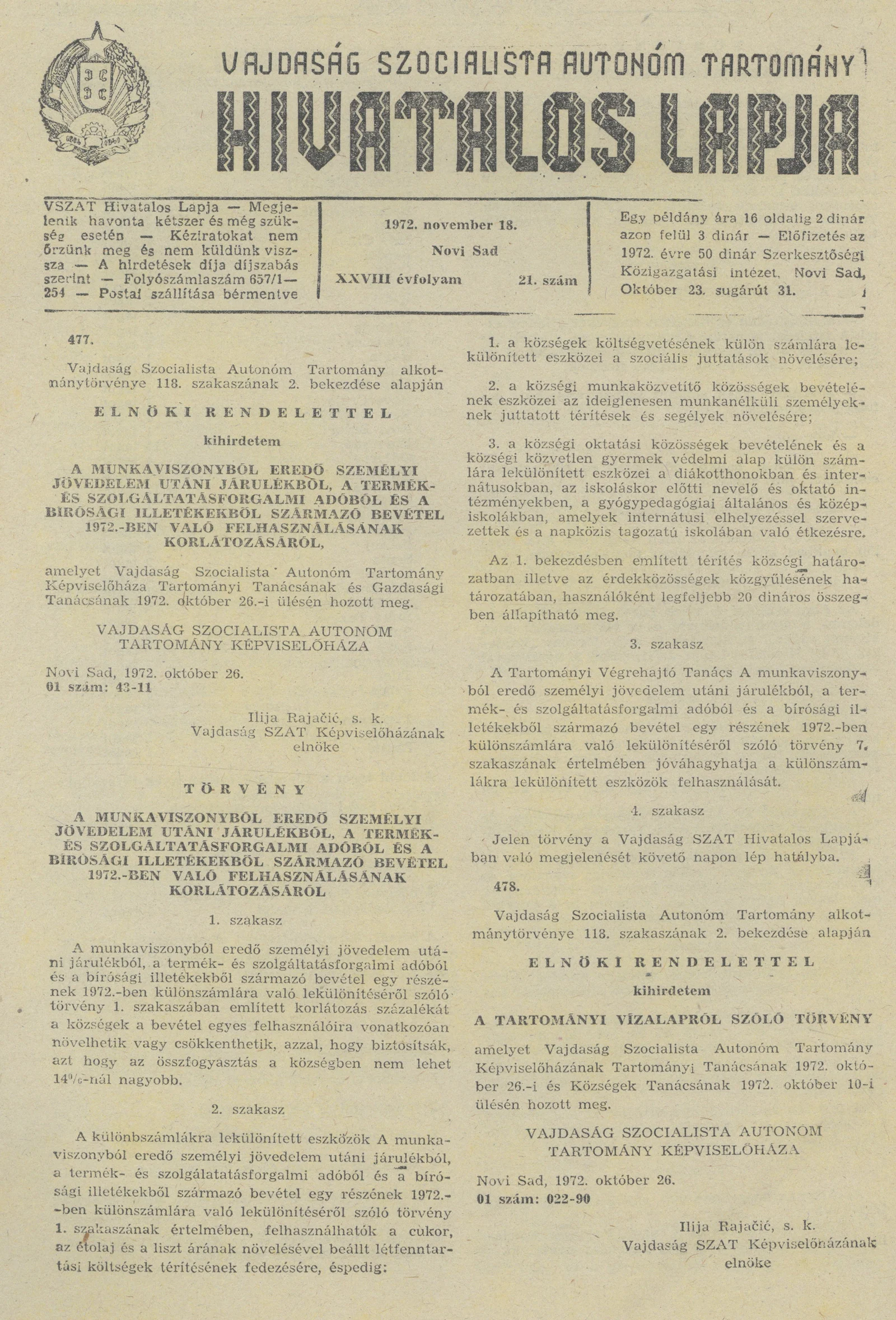 Vajdaság Szocialista Autonóm Tartomány Hivatalos Lapja, 28. évf. 1972. november 18. 21. sz. 705–716. oldal