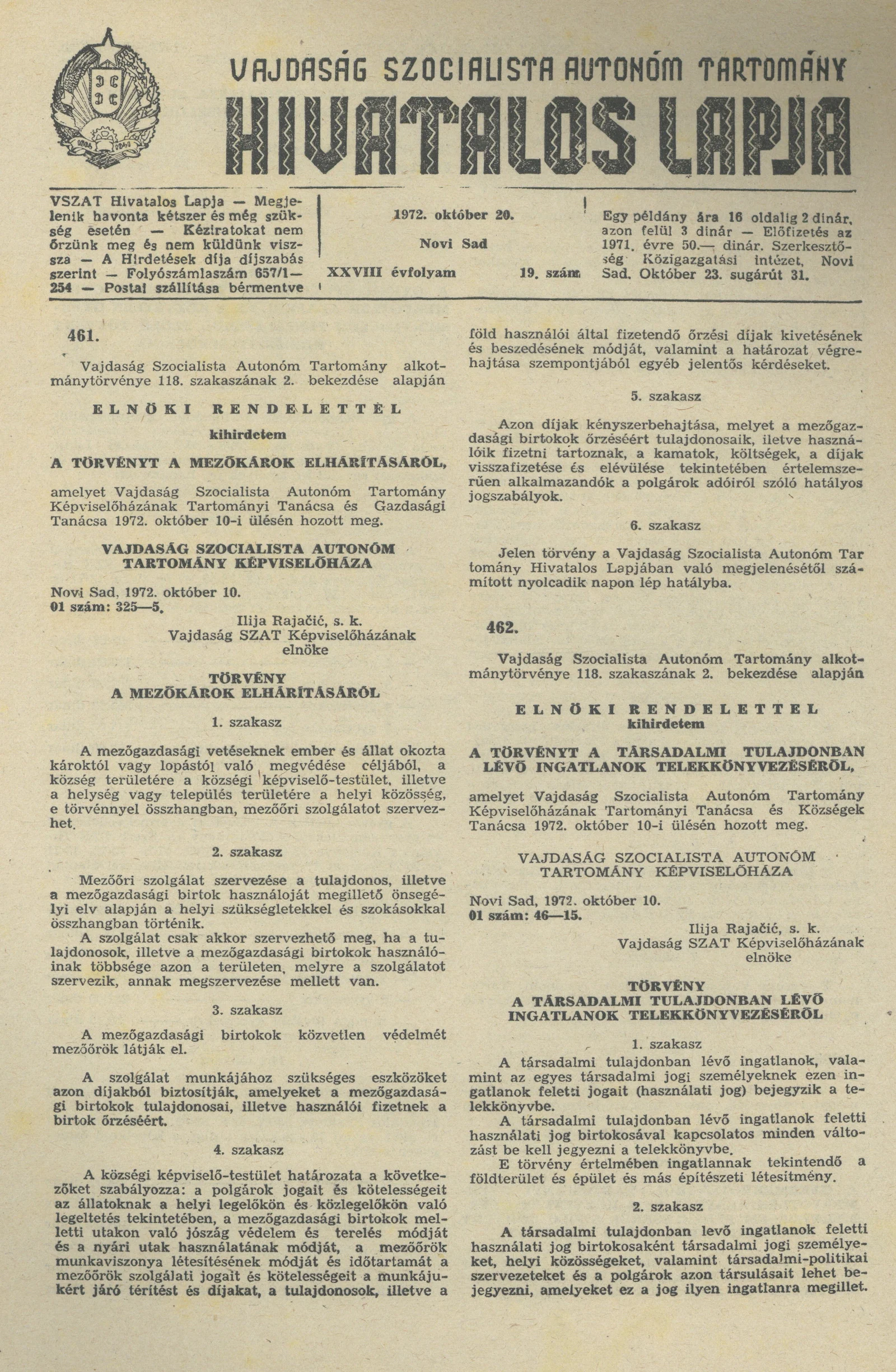Vajdaság Szocialista Autonóm Tartomány Hivatalos Lapja, 28. évf. 1972. október 20. 19. sz. 681–684. oldal