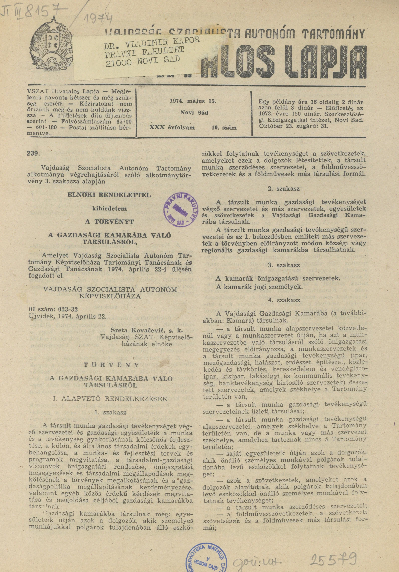 Vajdaság Szocialista Autonóm Tartomány Hivatalos Lapja, 30. évf. 1974. május 15. 10. sz. 345–396. oldal