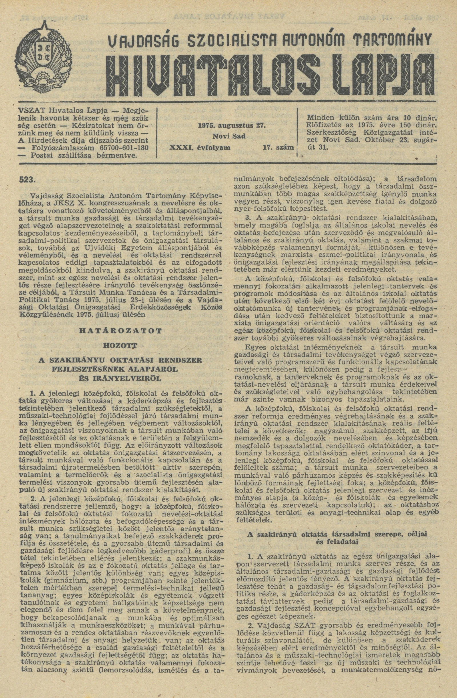 Vajdaság Szocialista Autonóm Tartomány Hivatalos Lapja, 31. évf. 1975. augusztus 27. 17. sz. 765–792. oldal