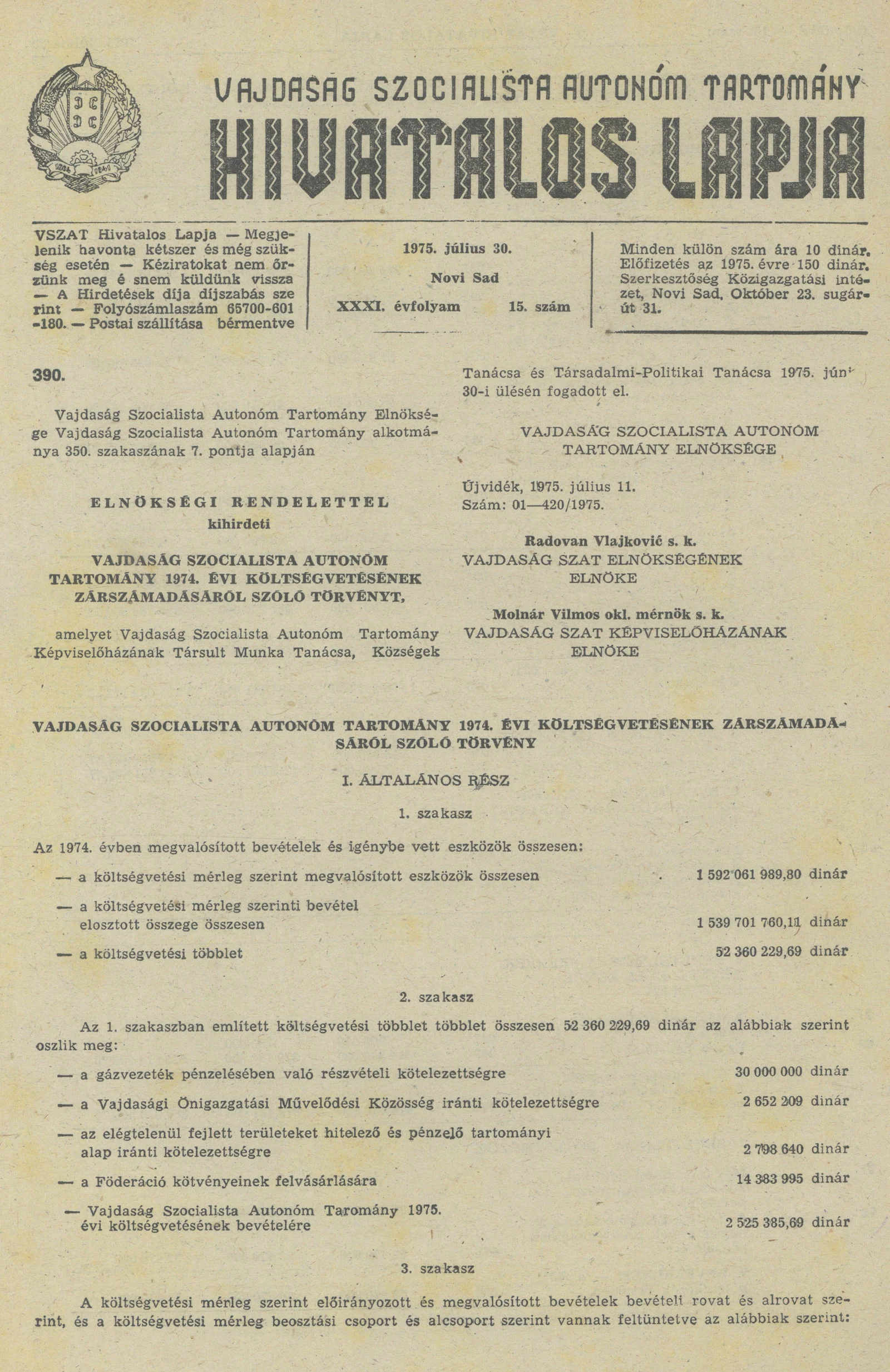 - Törvény a Vajdasági Szocialista Autonóm Tartomány 1974. évi költségvetésének zárszámadásáról605