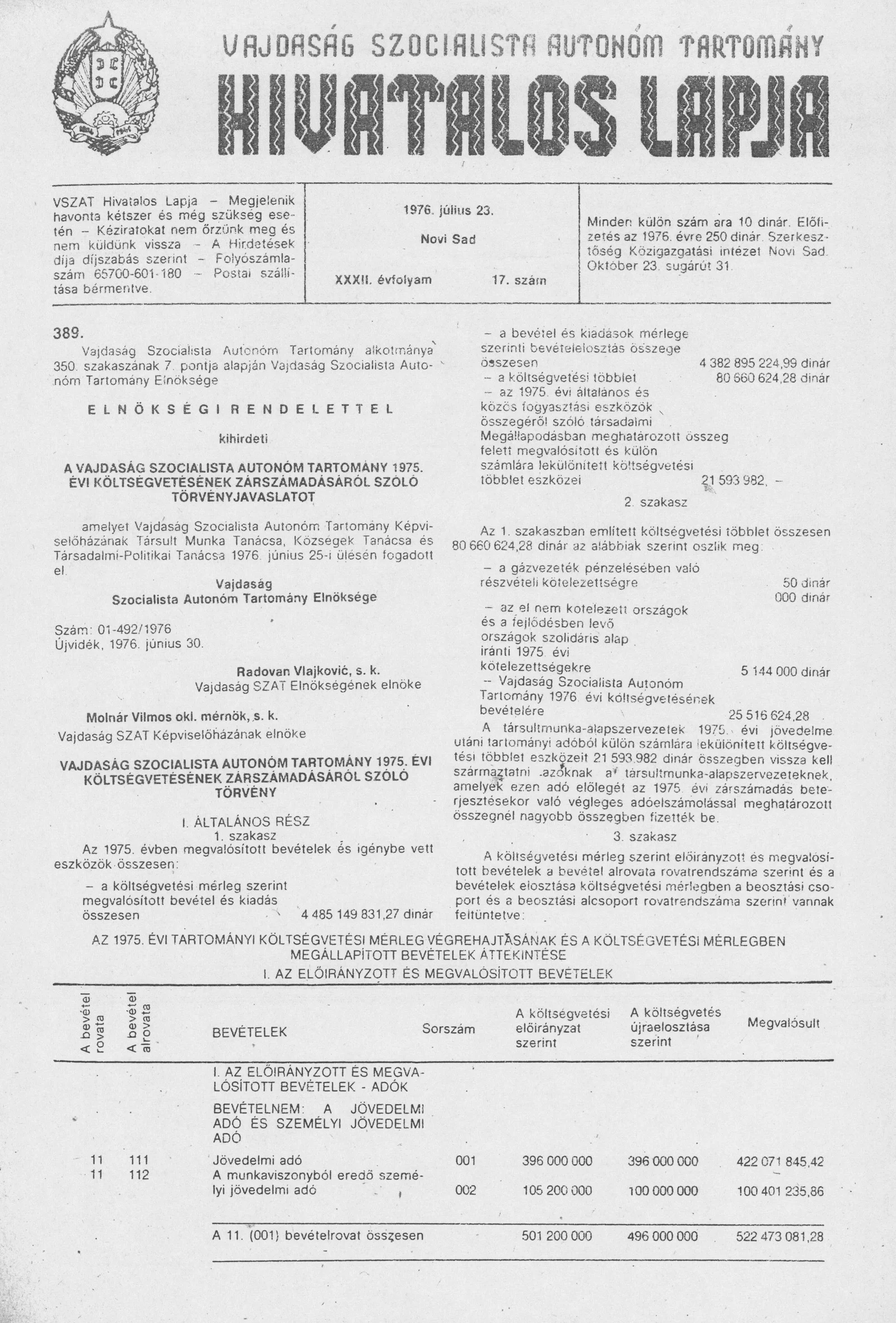- Vajdaság Szocialista Autonóm Tartomány 1975. évi költségvetésének zárszámadásáról szóló törvény553