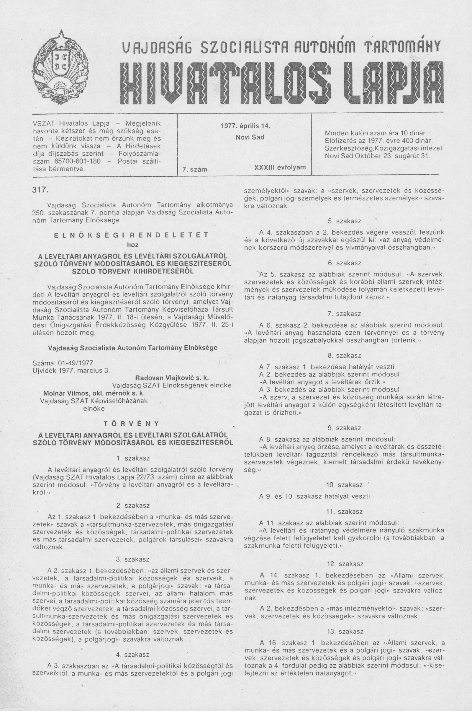 Vajdaság Szocialista Autonóm Tartomány Hivatalos Lapja, 33. évf. 1977. április 14. 7. sz. 361–388. oldal