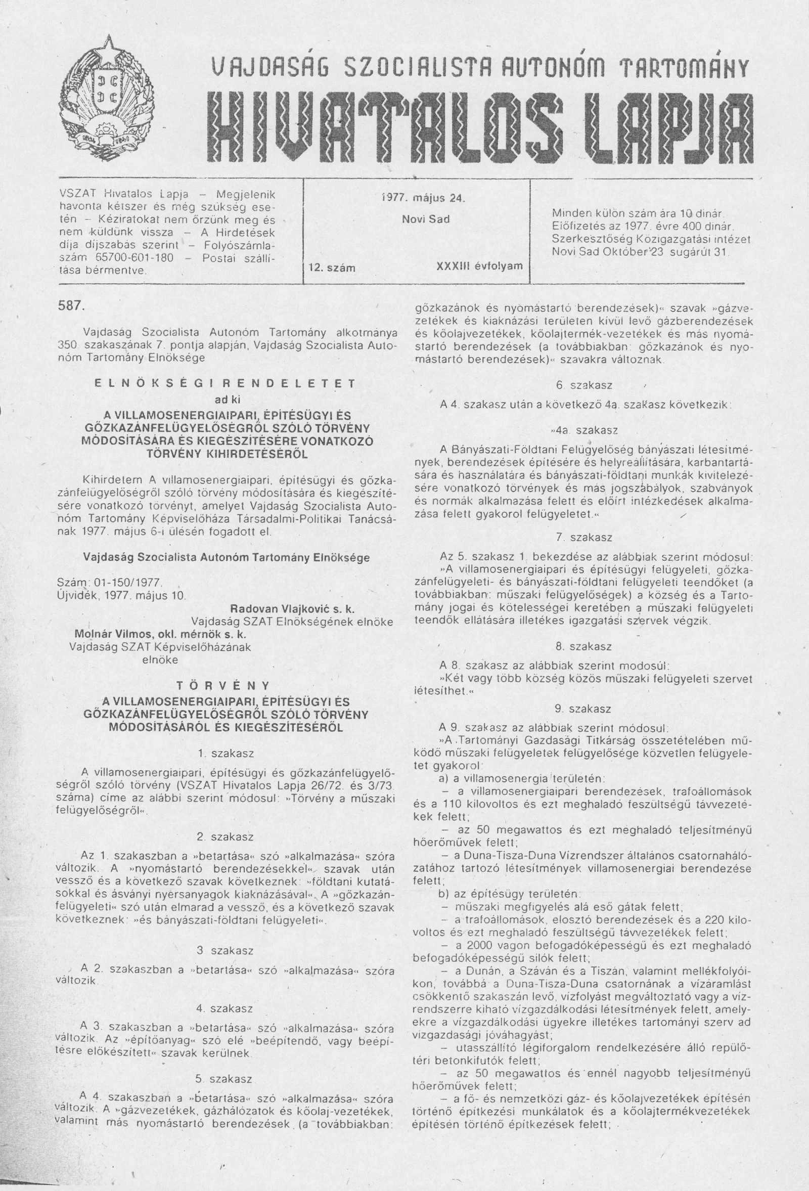 Vajdaság Szocialista Autonóm Tartomány Hivatalos Lapja, 33. évf. 1977. május 24. 12. sz. 641–652. oldal
