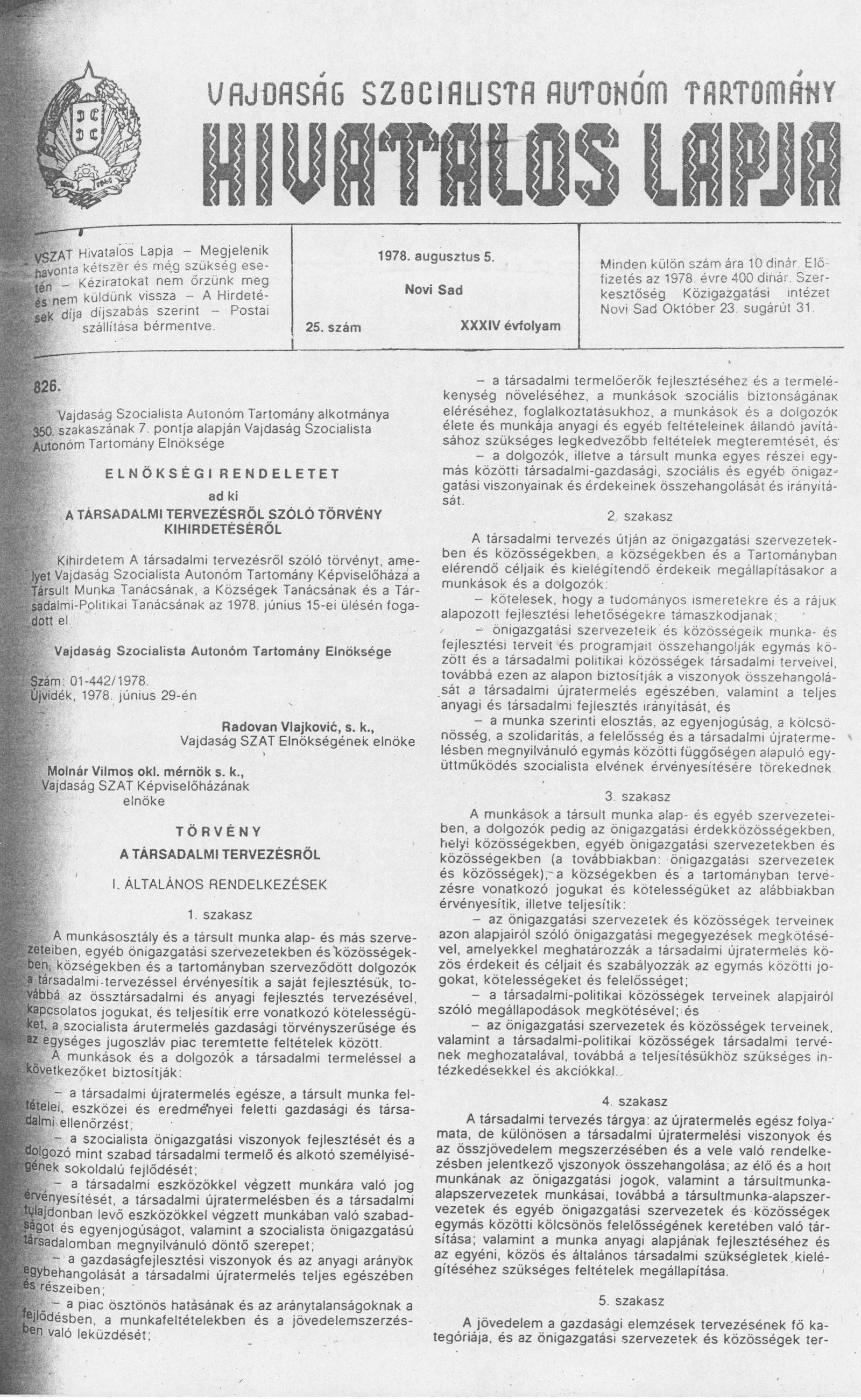 Vajdaság Szocialista Autonóm Tartomány Hivatalos Lapja, 34. évf. 1978. augusztus 5. 25. sz. 1033–1072. oldal