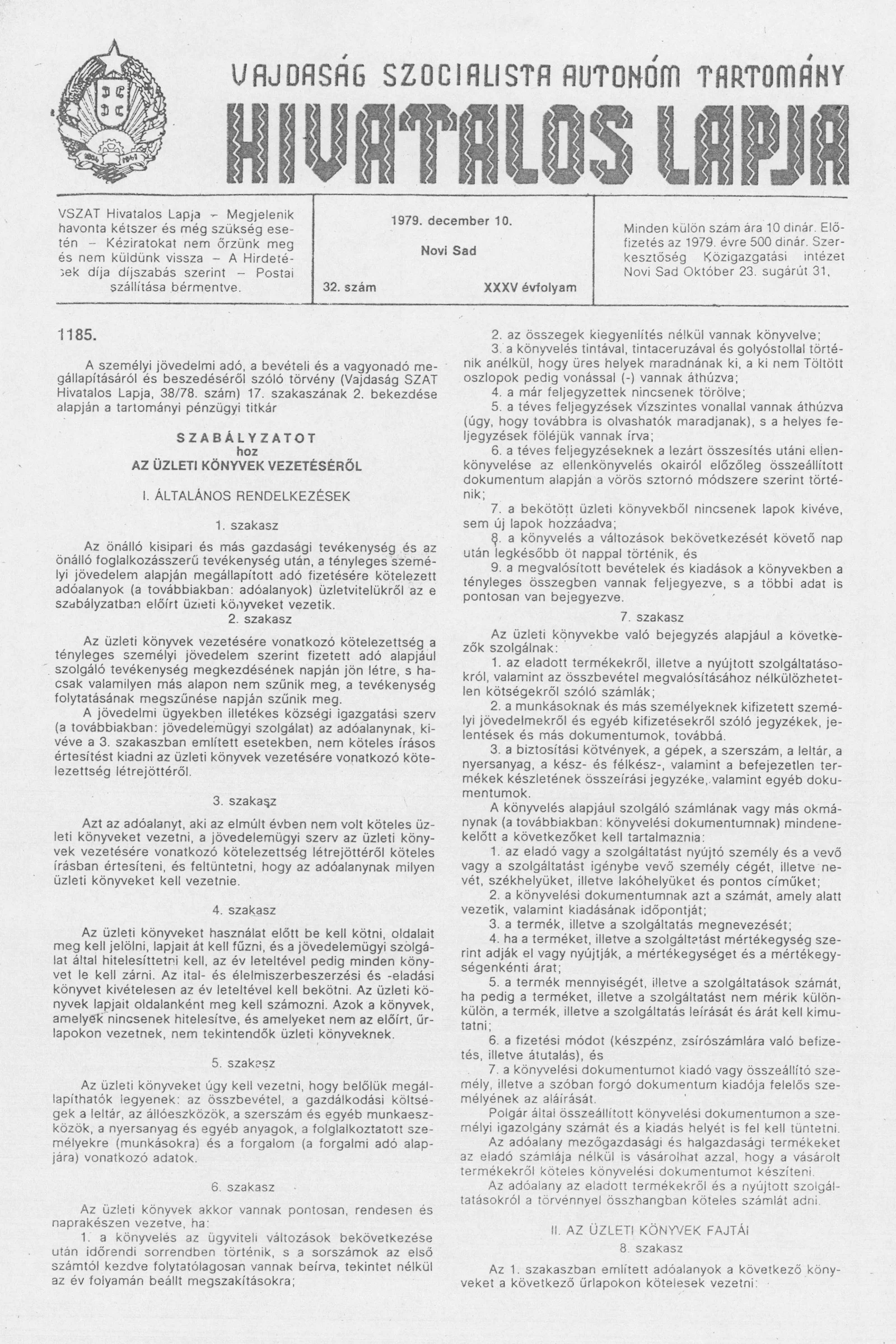 Vajdaság Szocialista Autonóm Tartomány Hivatalos Lapja, 35. évf. 1979. december 10. 32. sz. 1341–1380. oldal