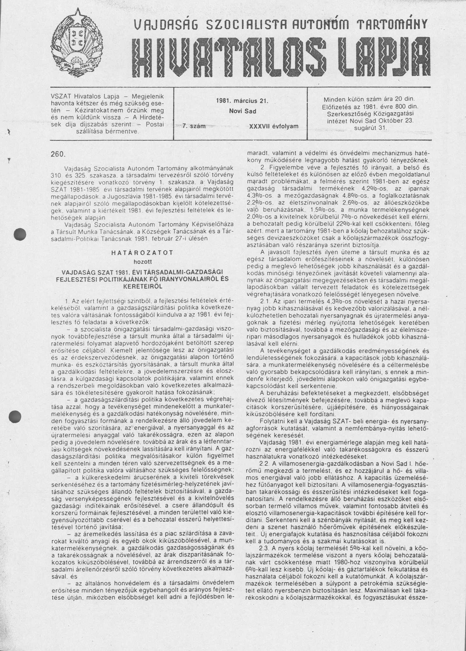 Vajdaság Szocialista Autonóm Tartomány Hivatalos Lapja, 37. évf. 1981. március 21. 7. sz.