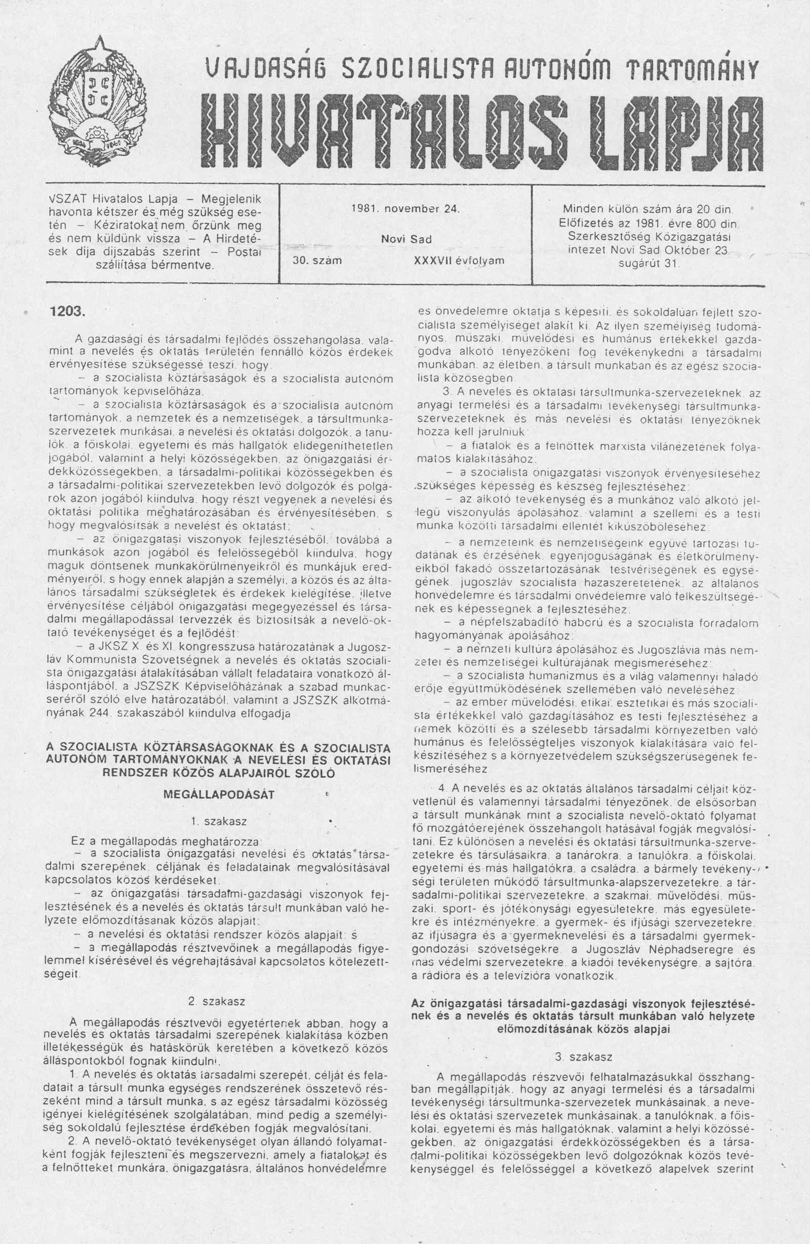Vajdaság Szocialista Autonóm Tartomány Hivatalos Lapja, 37. évf. 1981. november 24. 30. sz.