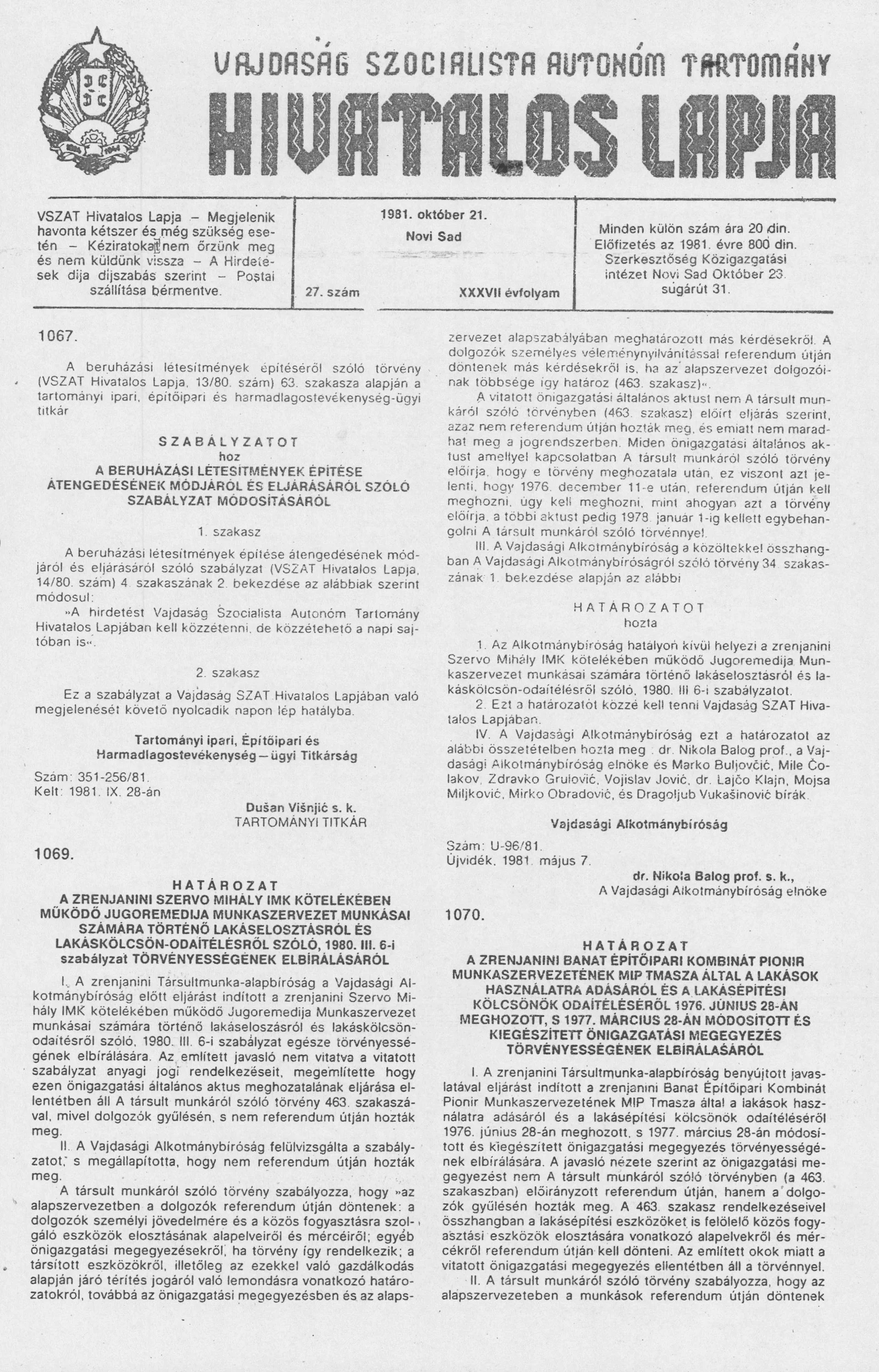 Vajdaság Szocialista Autonóm Tartomány Hivatalos Lapja, 37. évf. 1981. október 21. 27. sz.