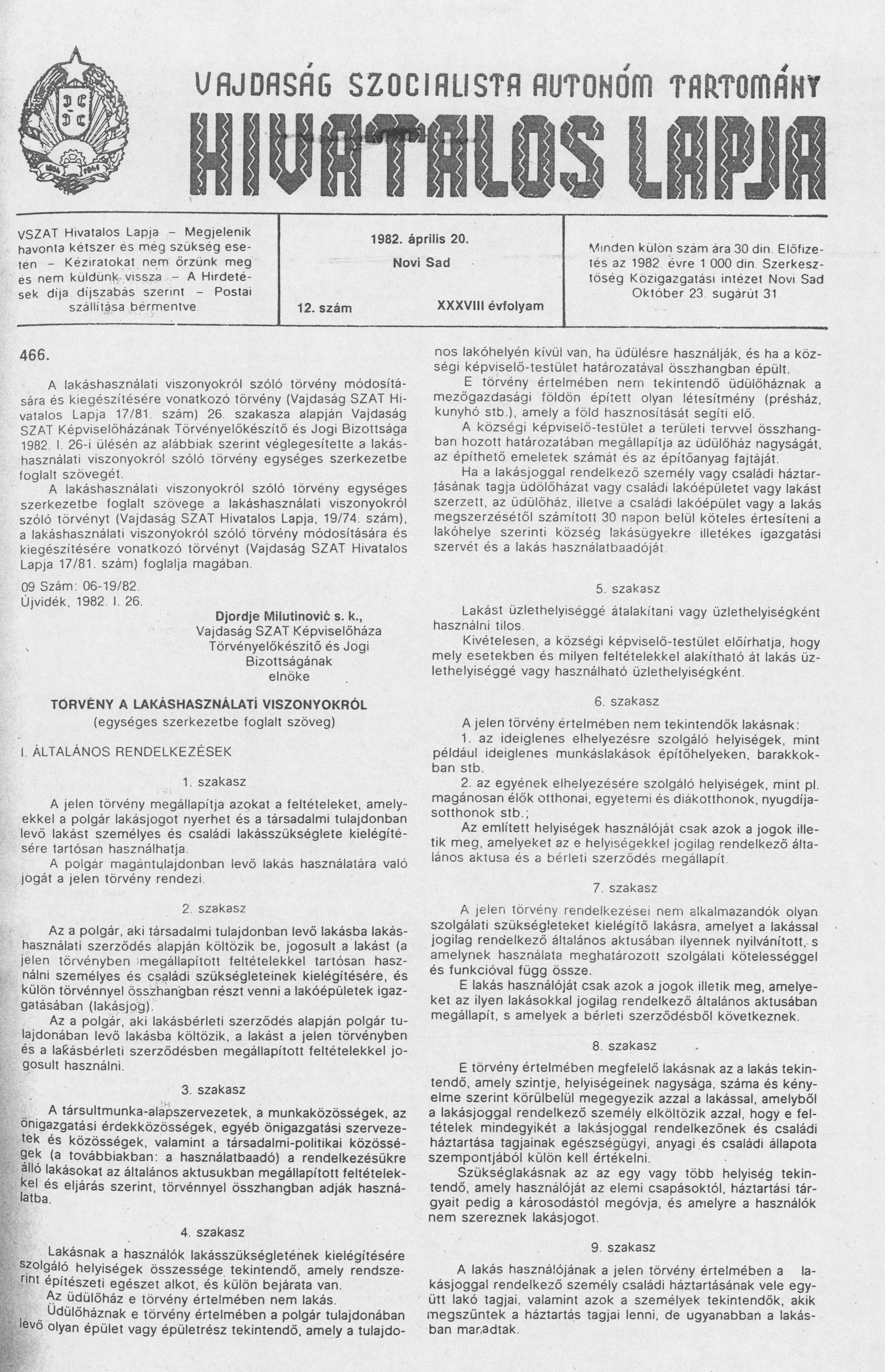 Vajdaság Szocialista Autonóm Tartomány Hivatalos Lapja, 38. évf. 1982. április 20. 12. sz.