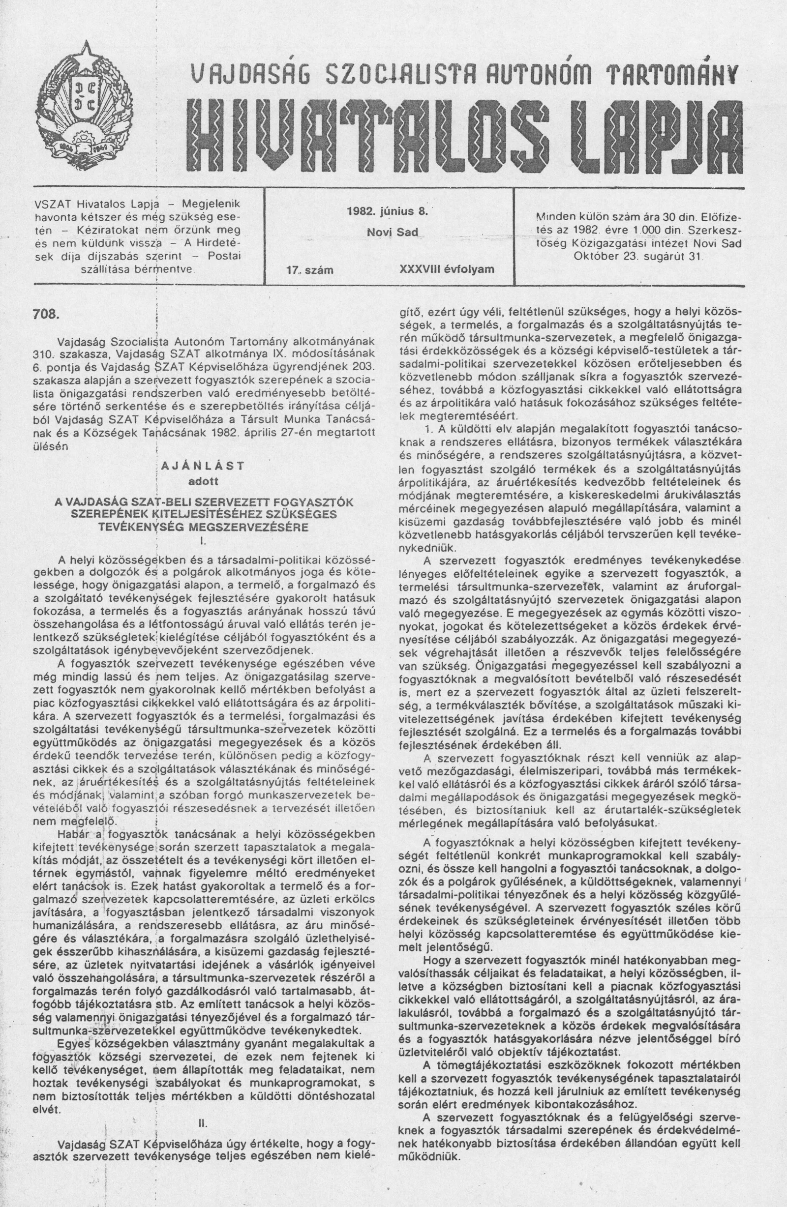 Vajdaság Szocialista Autonóm Tartomány Hivatalos Lapja, 38. évf. 1982. június 8. 17. sz.