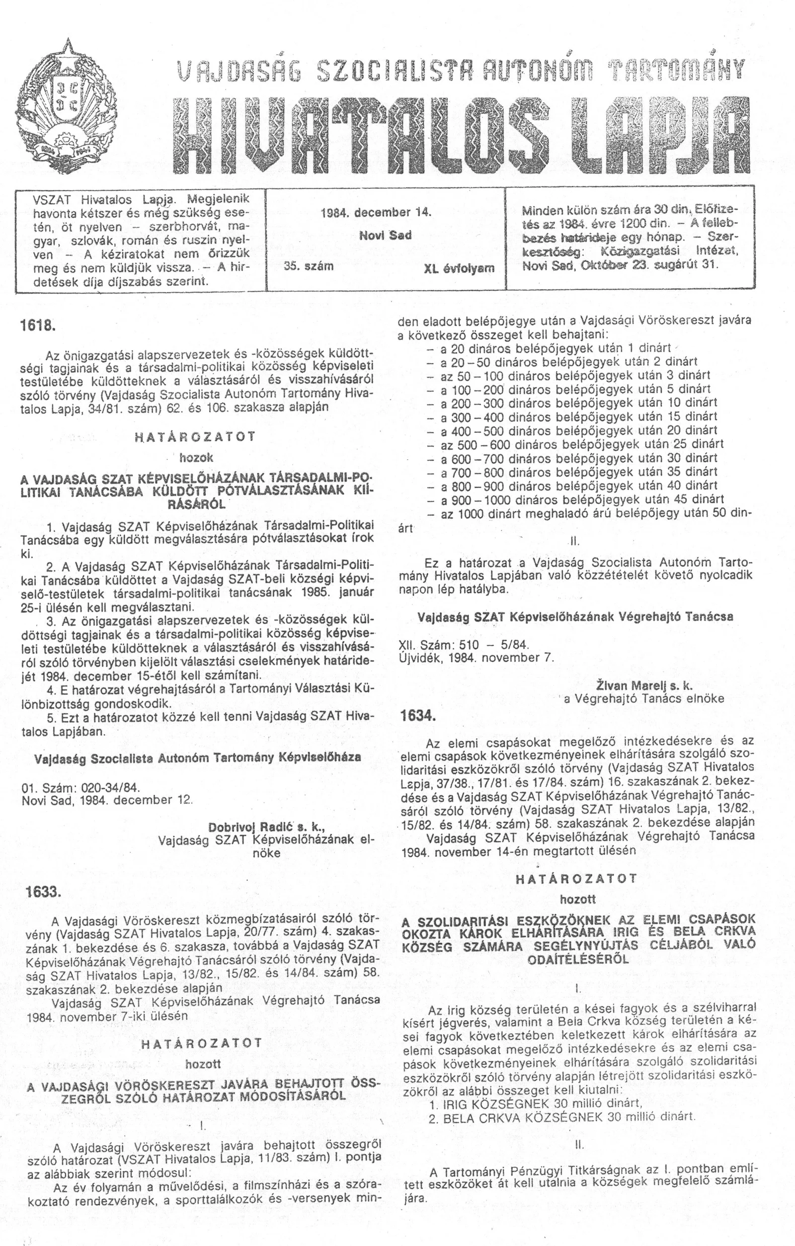 Vajdaság Szocialista Autonóm Tartomány Hivatalos Lapja, 40. évf. 1984. december 14. 35. sz.