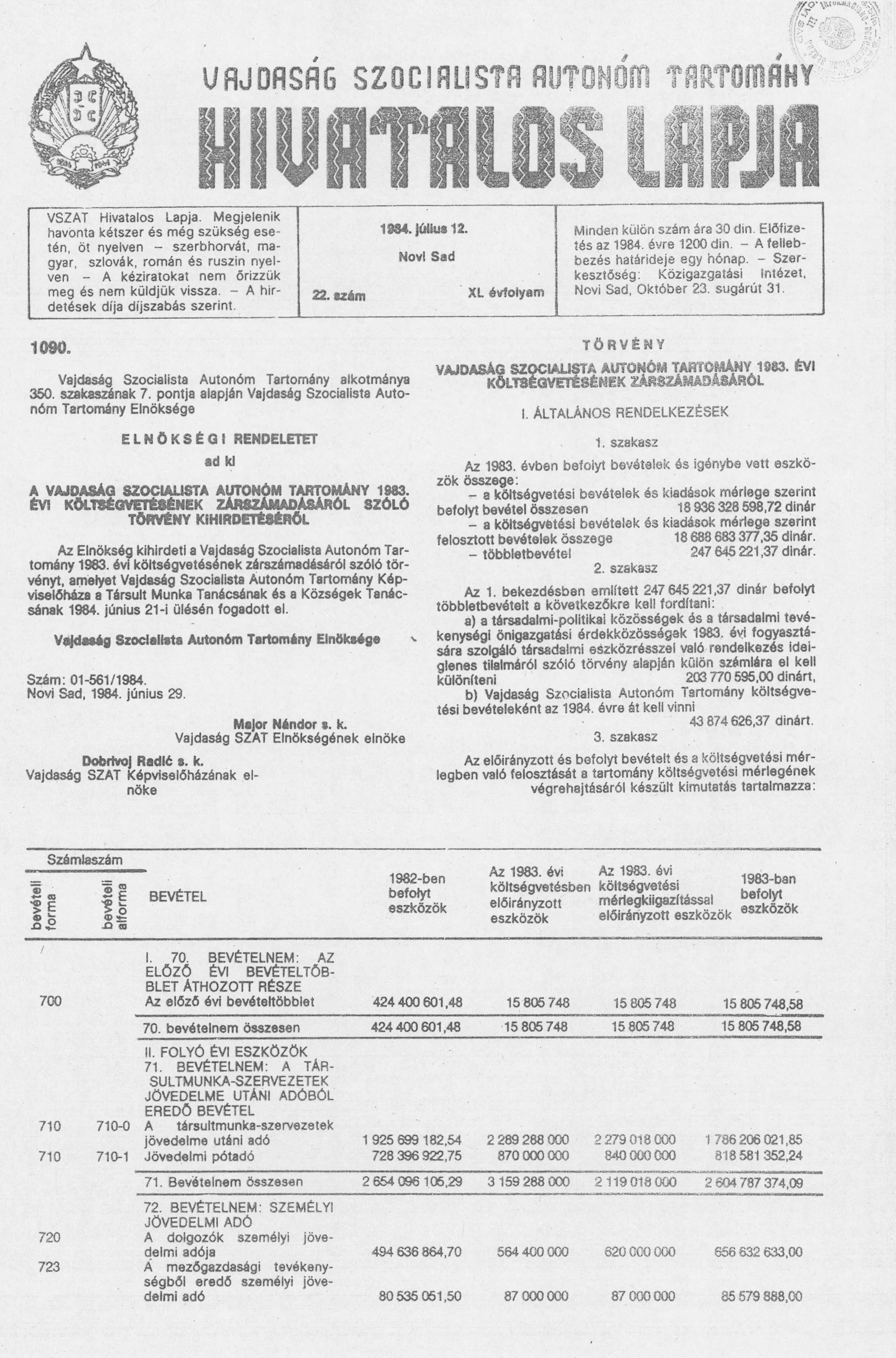 Vajdaság Szocialista Autonóm Tartomány Hivatalos Lapja, 40. évf. 1984. július 12. 22. sz.