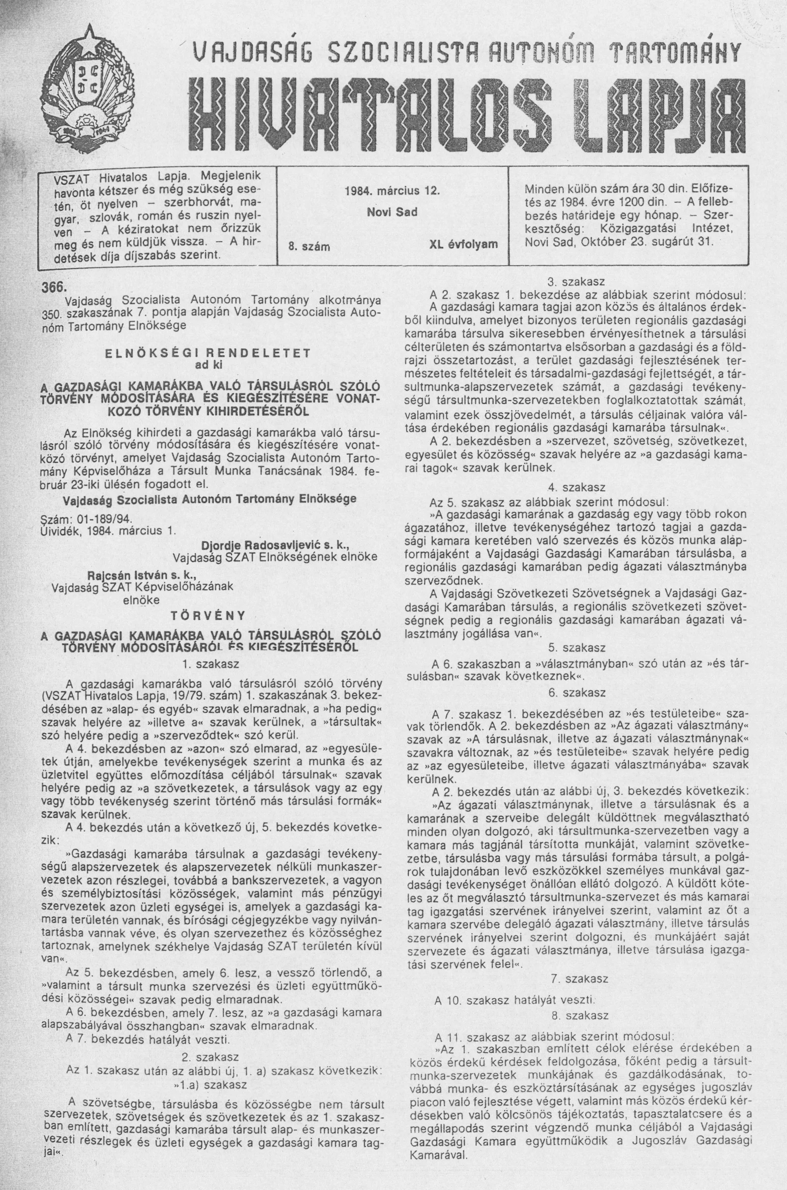 Vajdaság Szocialista Autonóm Tartomány Hivatalos Lapja, 40. évf. 1984. március 12. 8. sz.