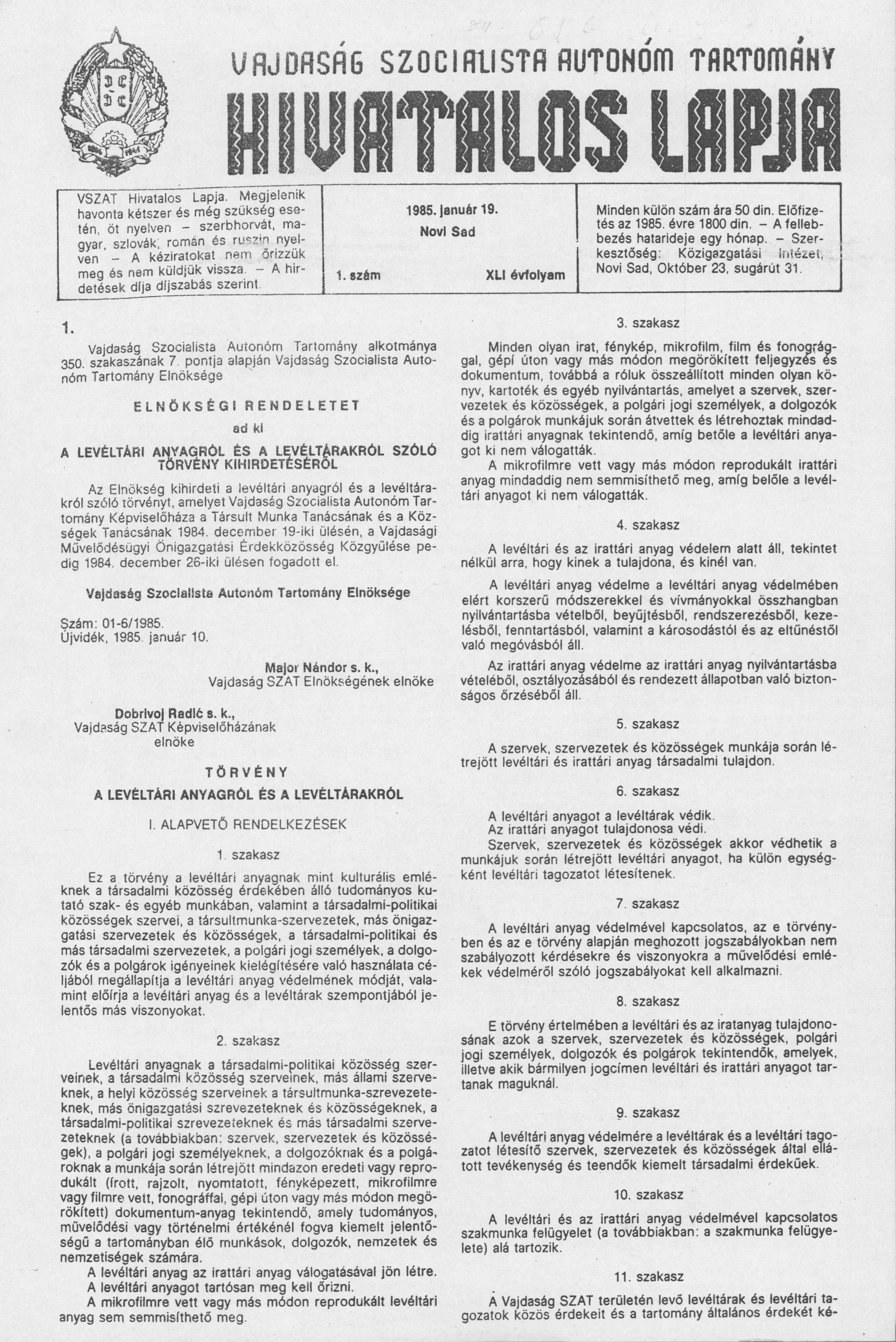 Vajdaság Szocialista Autonóm Tartomány Hivatalos Lapja, 41. évf. 1985. január 19. 1. sz.