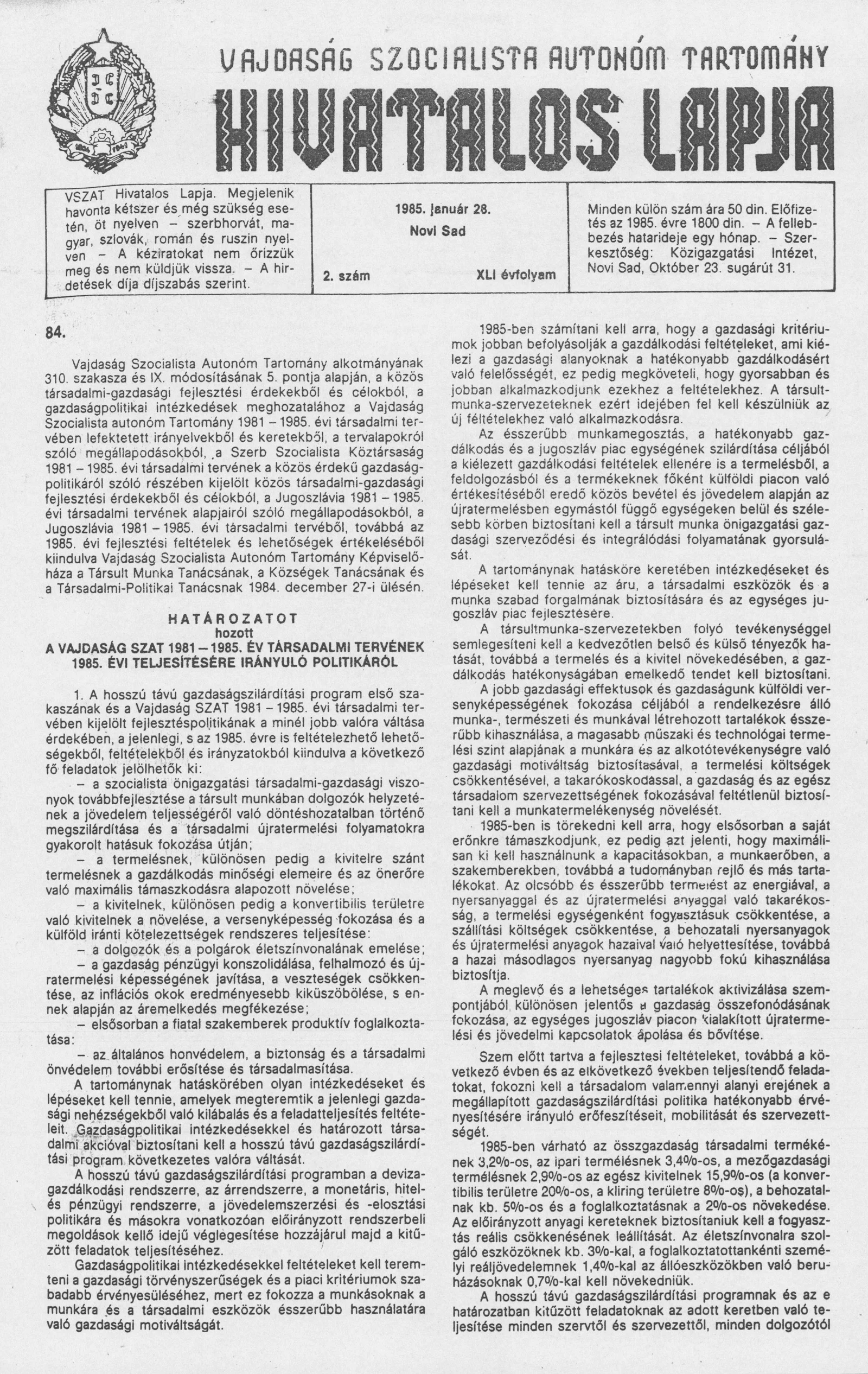 Vajdaság Szocialista Autonóm Tartomány Hivatalos Lapja, 41. évf. 1985. január 28. 2. sz.