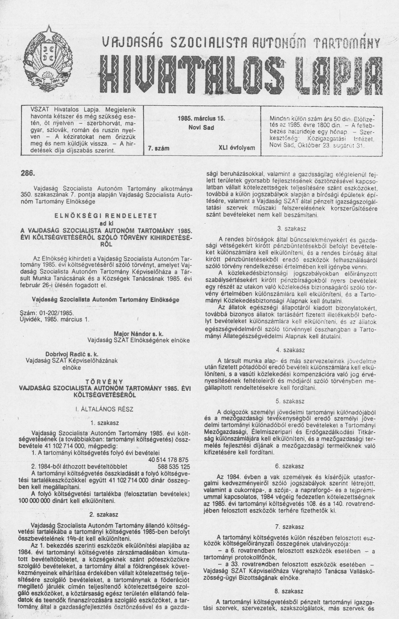 Vajdaság Szocialista Autonóm Tartomány Hivatalos Lapja, 41. évf. 1985. március 15. 7. sz.