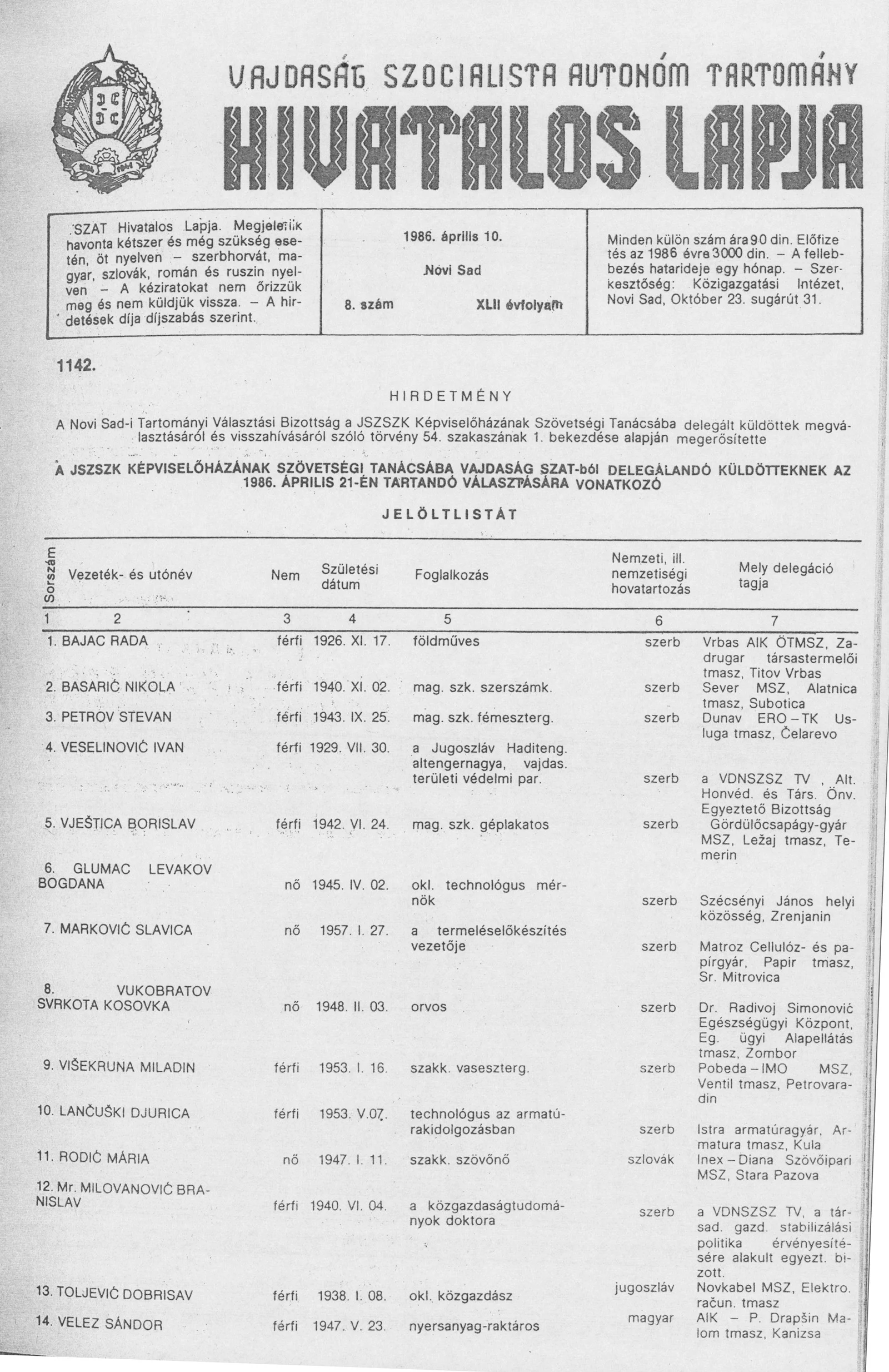 Vajdaság Szocialista Autonóm Tartomány Hivatalos Lapja, 42. évf. 1986. április 10. 8. sz.