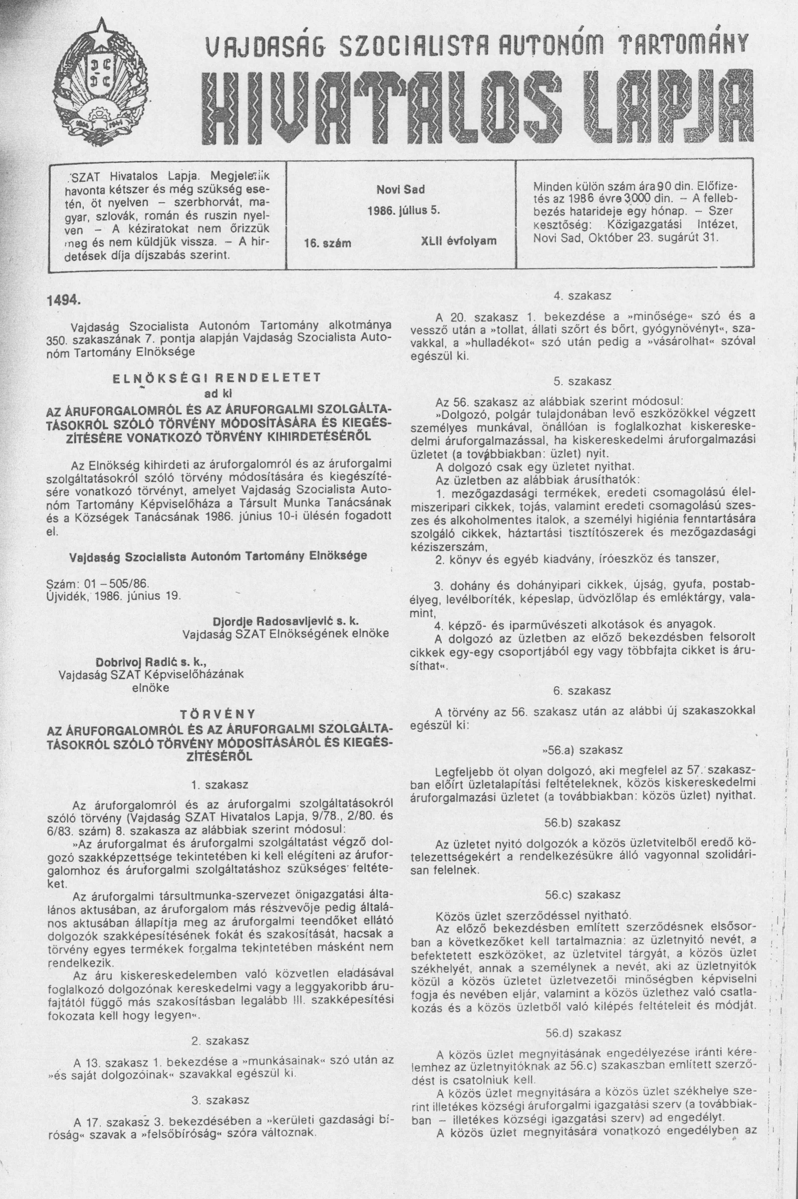 Vajdaság Szocialista Autonóm Tartomány Hivatalos Lapja, 42. évf. 1986. július 5. 16. sz.