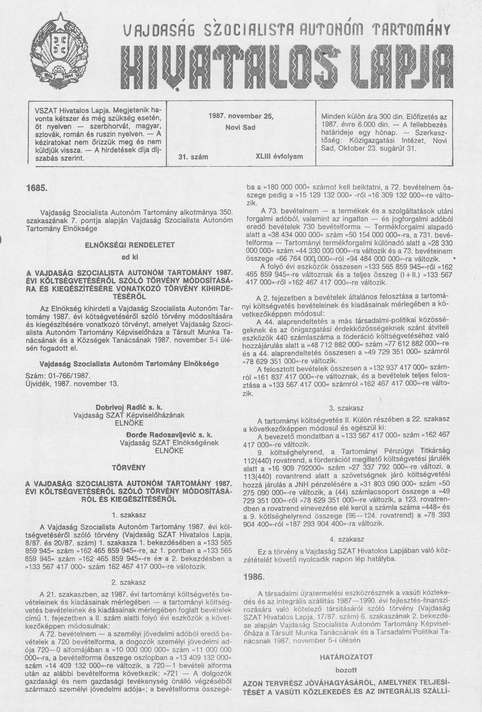 Vajdaság Szocialista Autonóm Tartomány Hivatalos Lapja, 43. évf. 1987. november 25. 31. sz.