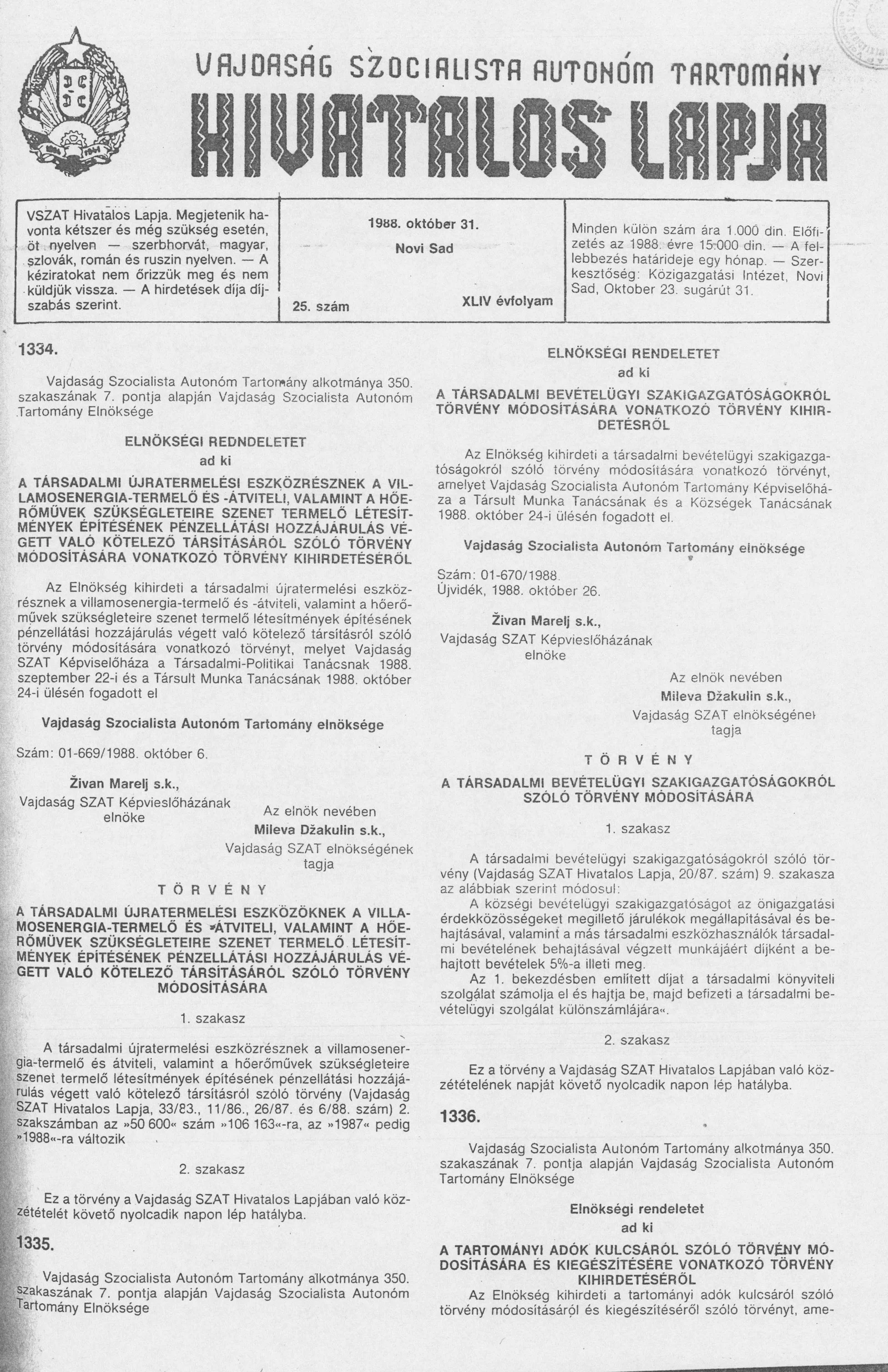 Vajdaság Szocialista Autonóm Tartomány Hivatalos Lapja, 44. évf. 1988. október 31. 25. sz.