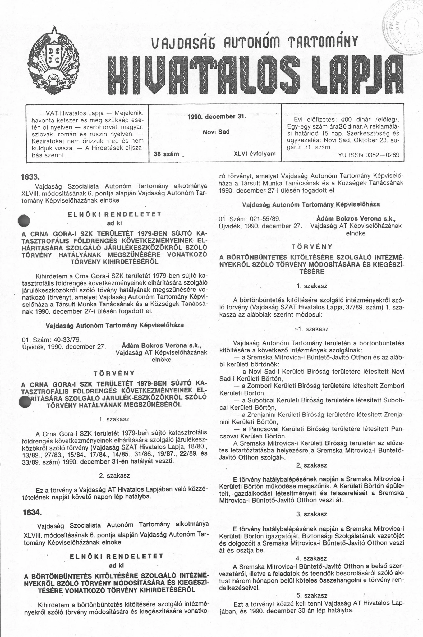Vajdaság Szocialista Autonóm Tartomány Hivatalos Lapja, 46. évf. 1990. december 31. 38. sz.