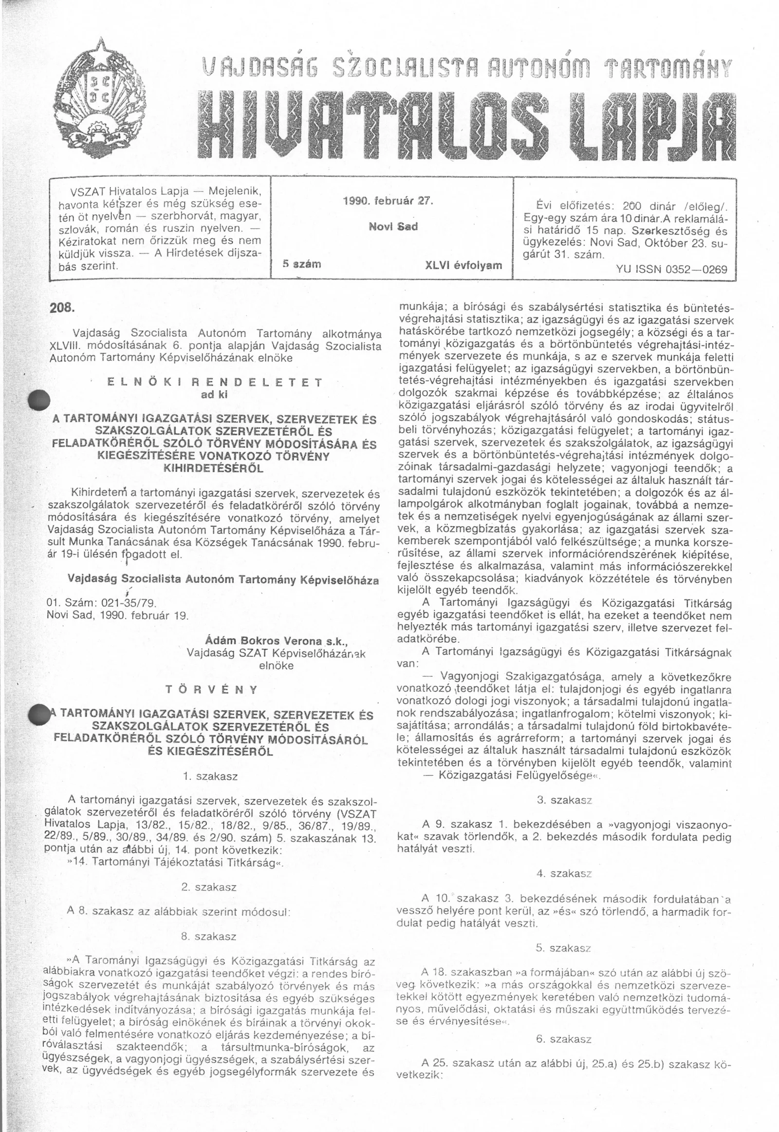 Vajdaság Szocialista Autonóm Tartomány Hivatalos Lapja, 46. évf. 1990. február 27. 5. sz.