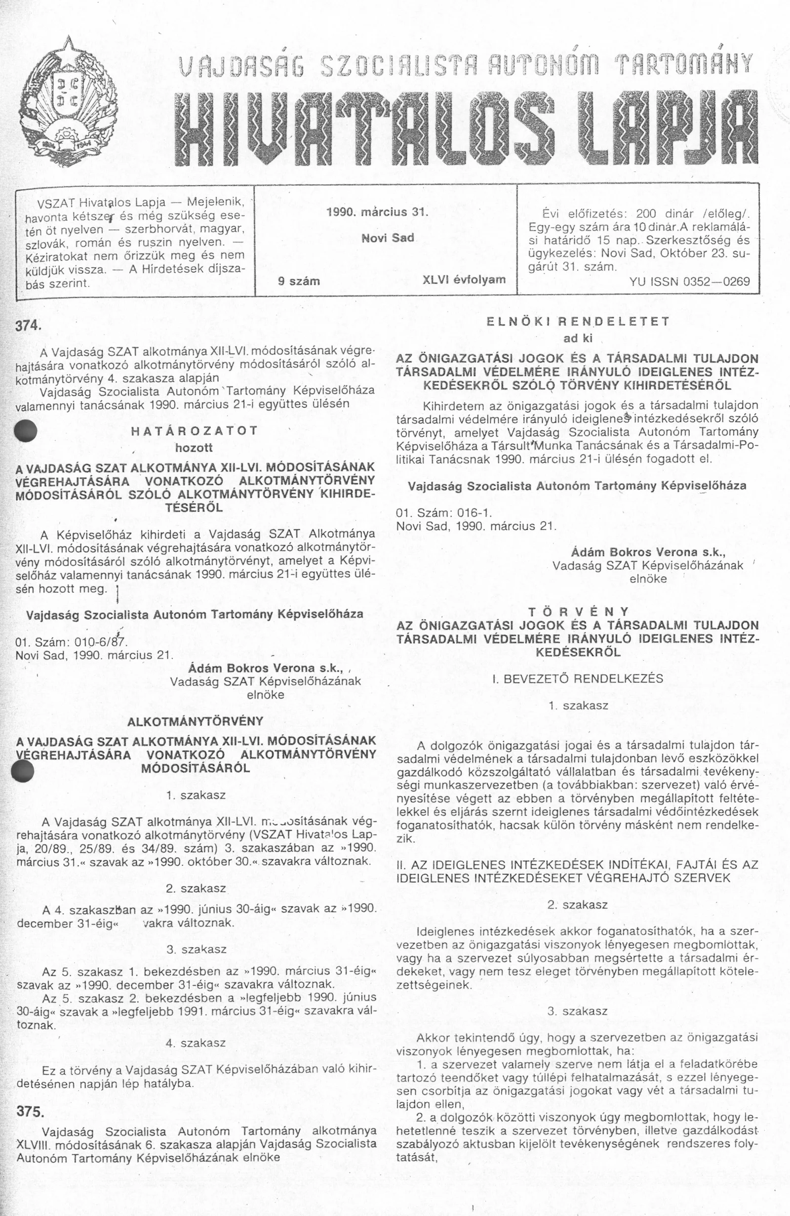 Vajdaság Szocialista Autonóm Tartomány Hivatalos Lapja, 46. évf. 1990. március 31. 9. sz.