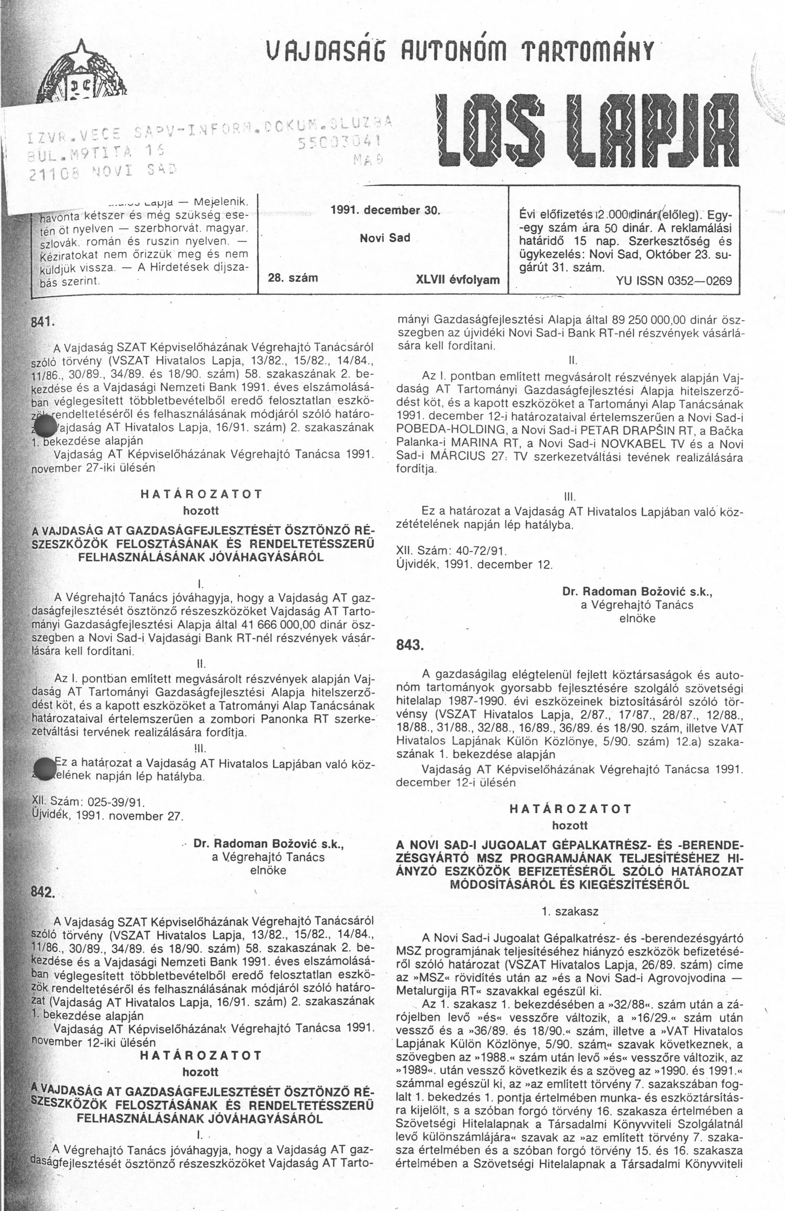 Vajdaság Szocialista Autonóm Tartomány Hivatalos Lapja, 47. évf. 1991. december 30. 28. sz.