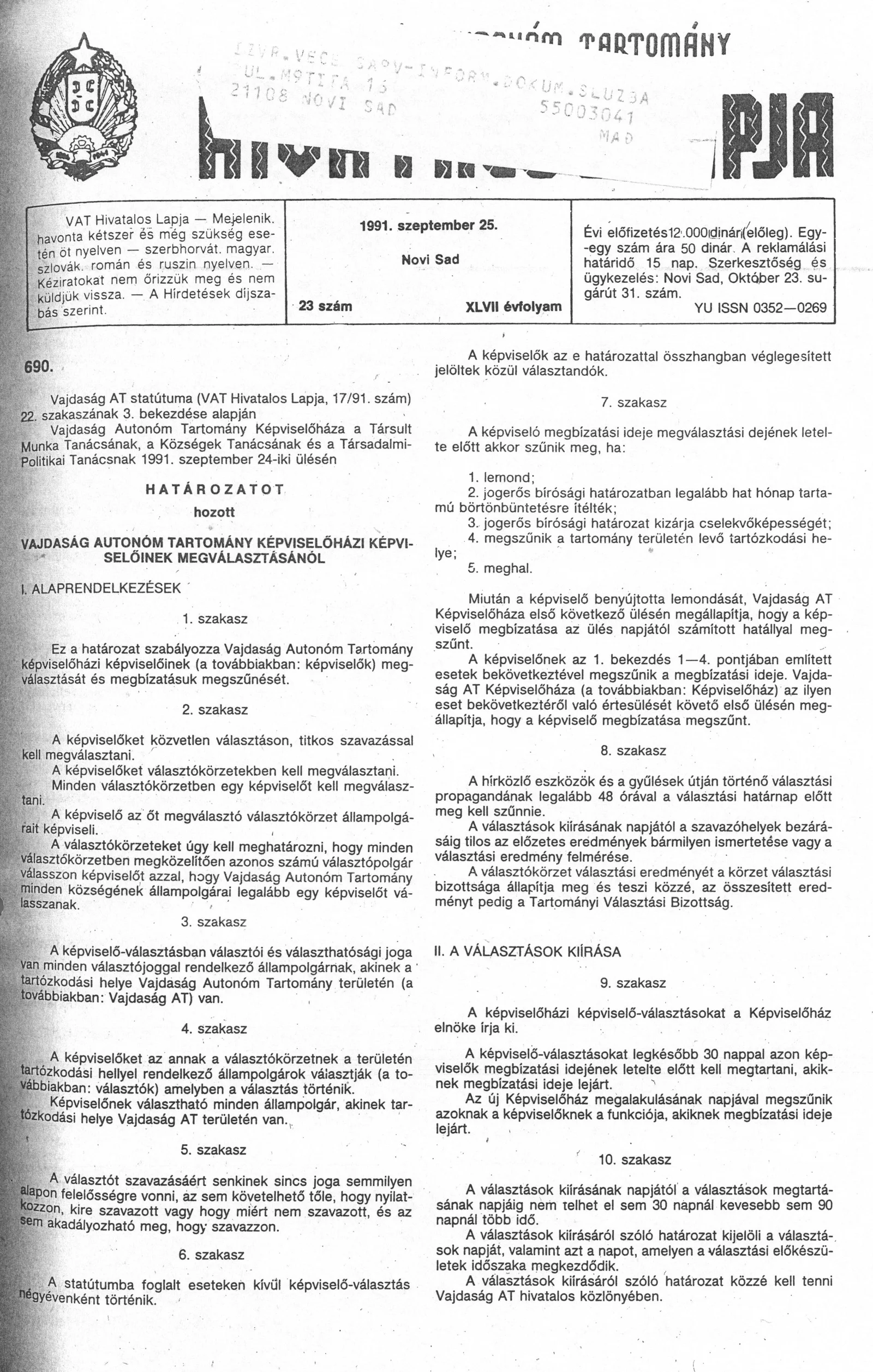 Vajdaság Szocialista Autonóm Tartomány Hivatalos Lapja, 47. évf. 1991. szeptember 25. 23. sz.