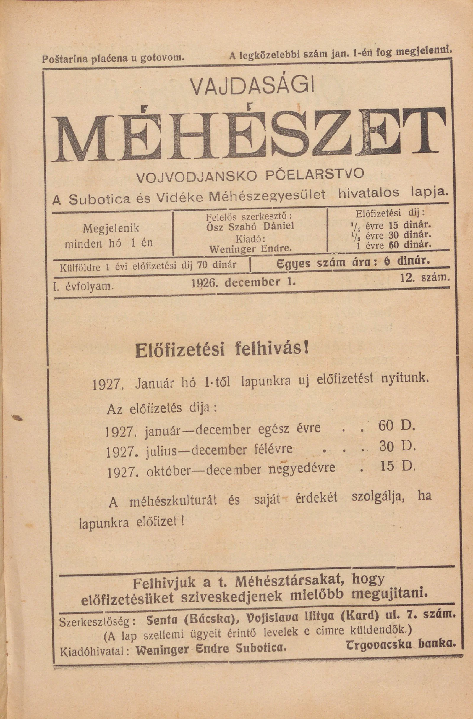 Vajdasági méhészet, 1. évf. 1926. december 1. 12. sz.