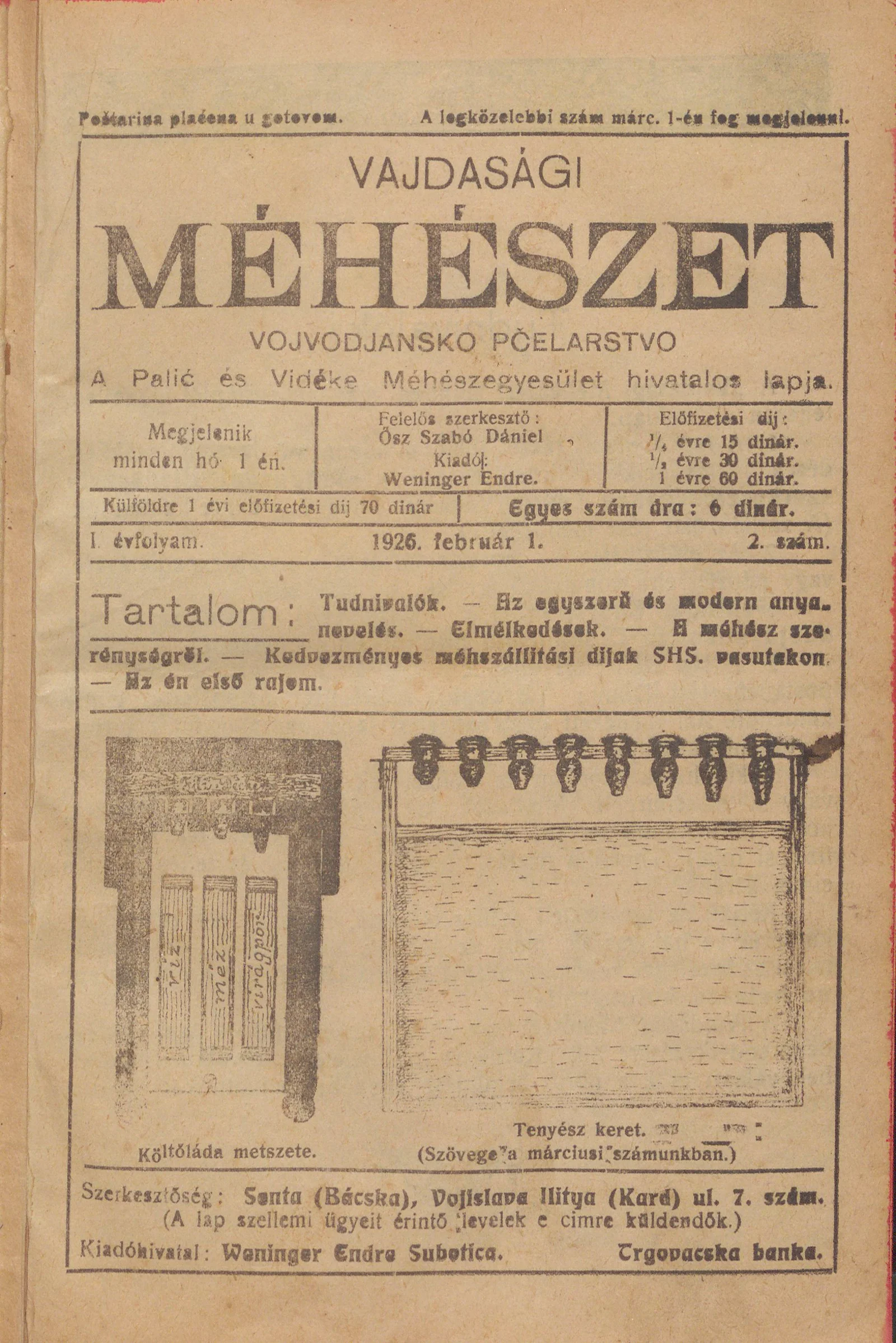 Vajdasági méhészet, 1. évf. 1926. február 1. 2. sz.