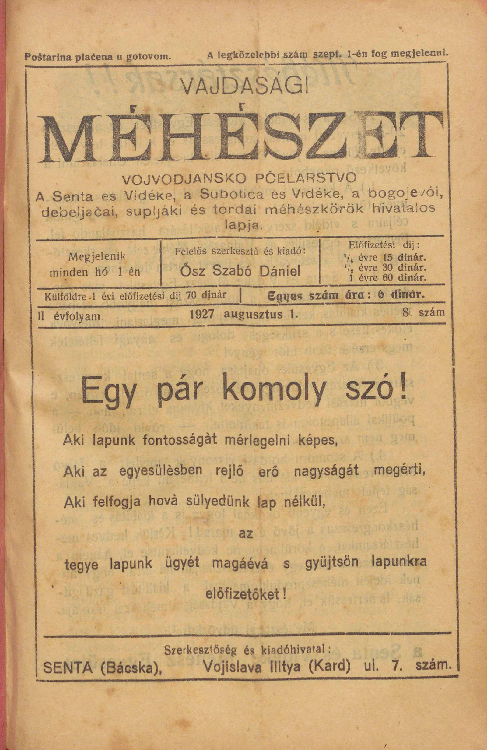Vajdasági méhészet, 2. évf. 1927. augusztus 1. 8. sz.