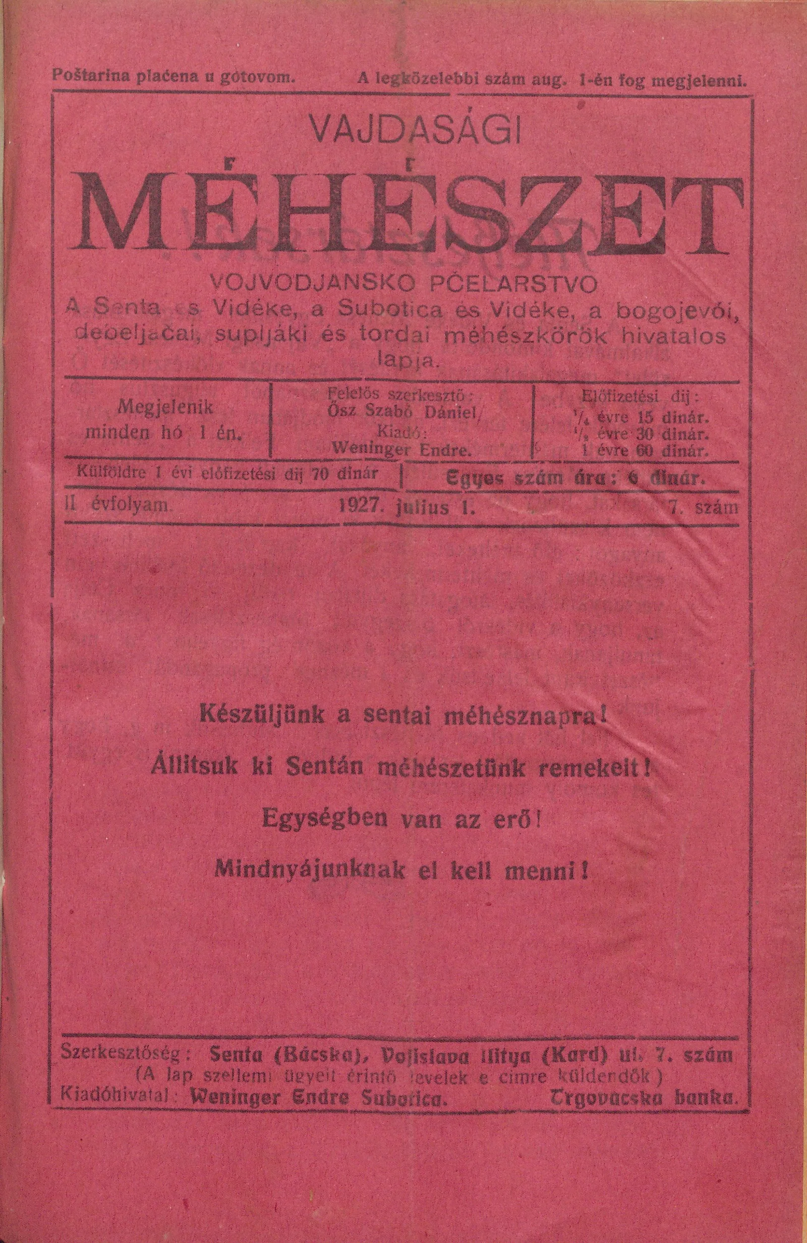 Vajdasági méhészet, 2. évf. 1927. július 1. 7. sz.