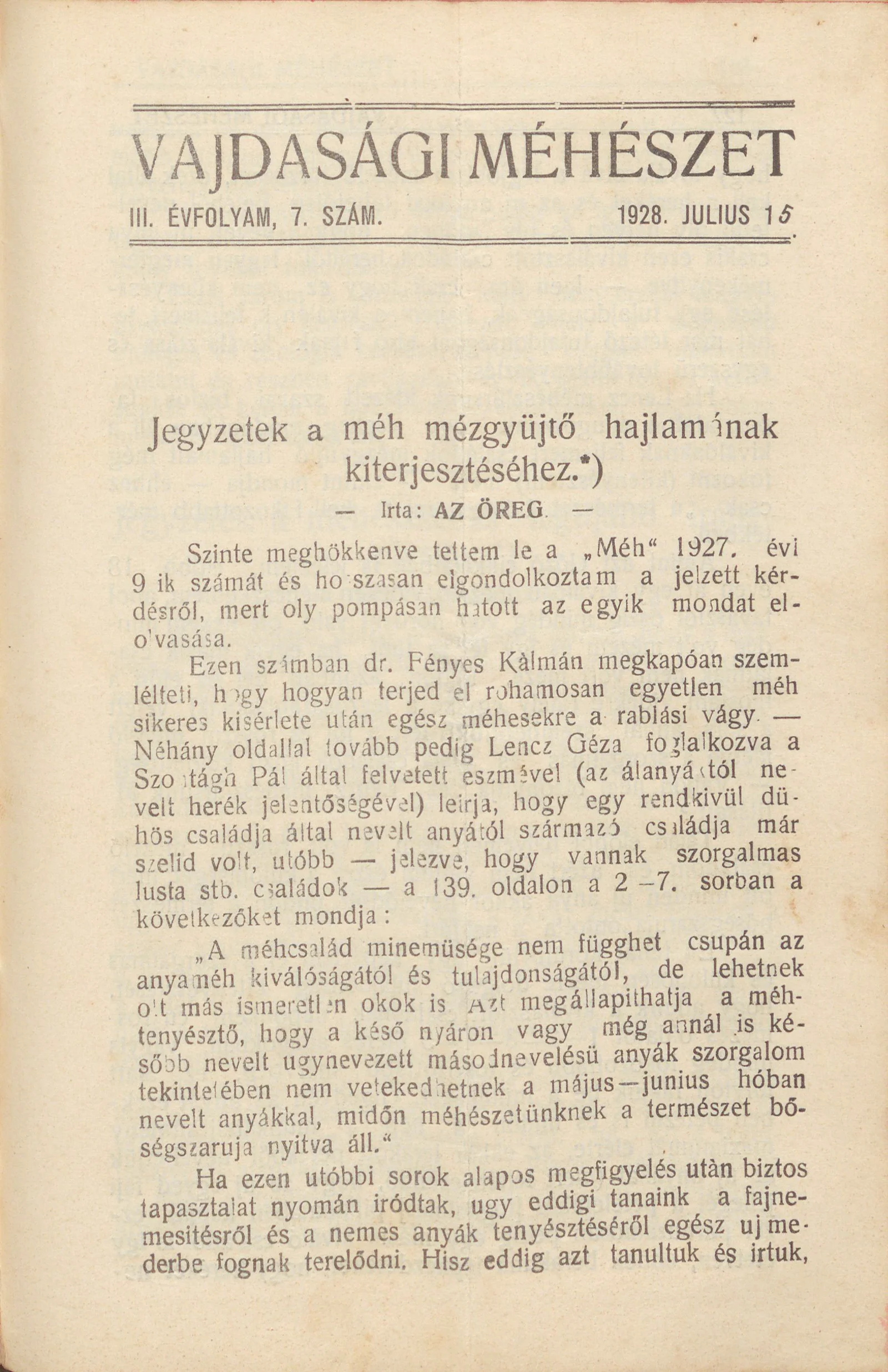 Vajdasági méhészet, 3. évf. 1928. július 15. 7. sz.