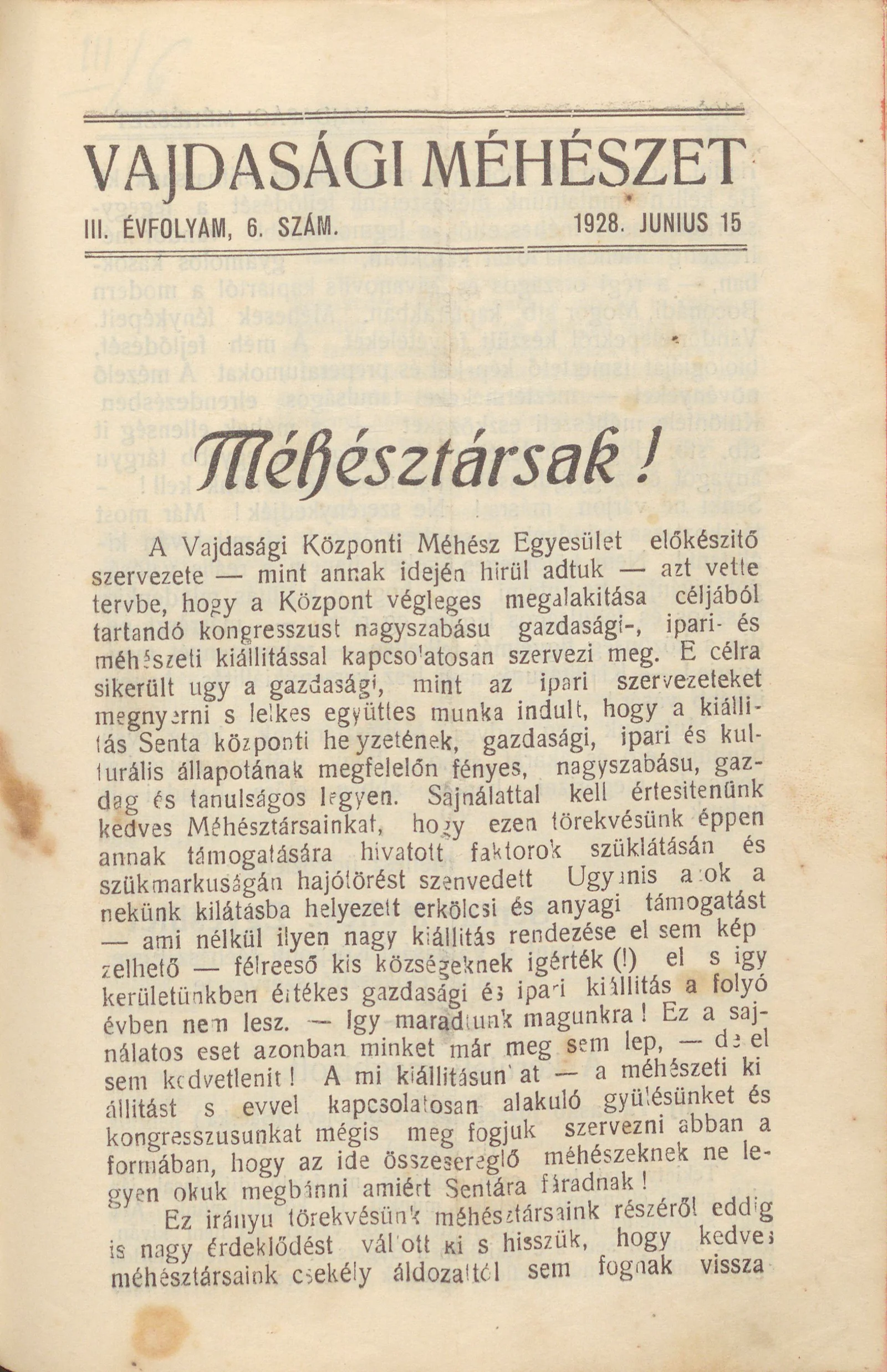 Vajdasági méhészet, 3. évf. 1928. június 15. 6. sz.