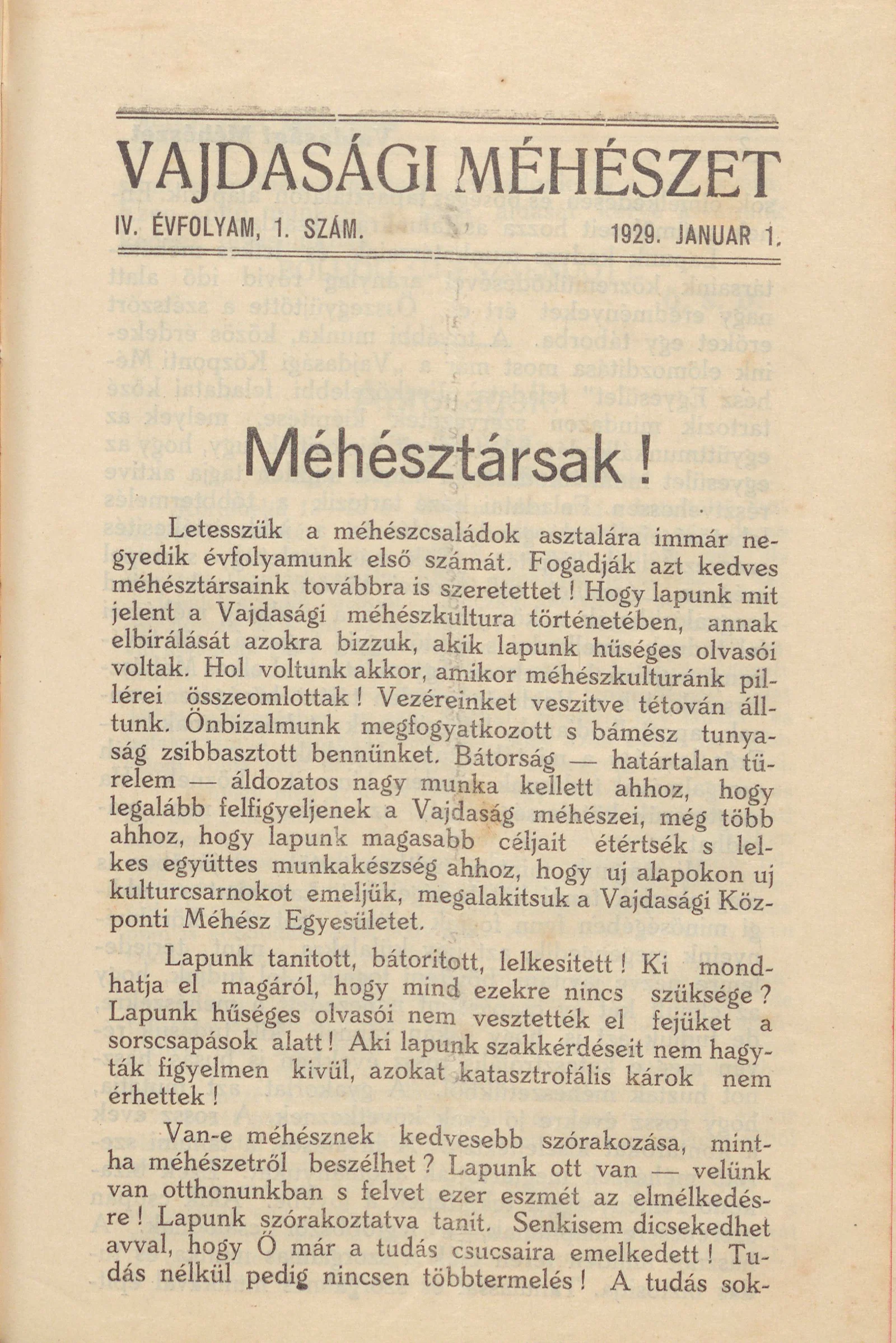 Vajdasági méhészet, 4. évf. 1929. január 1. 1. sz.