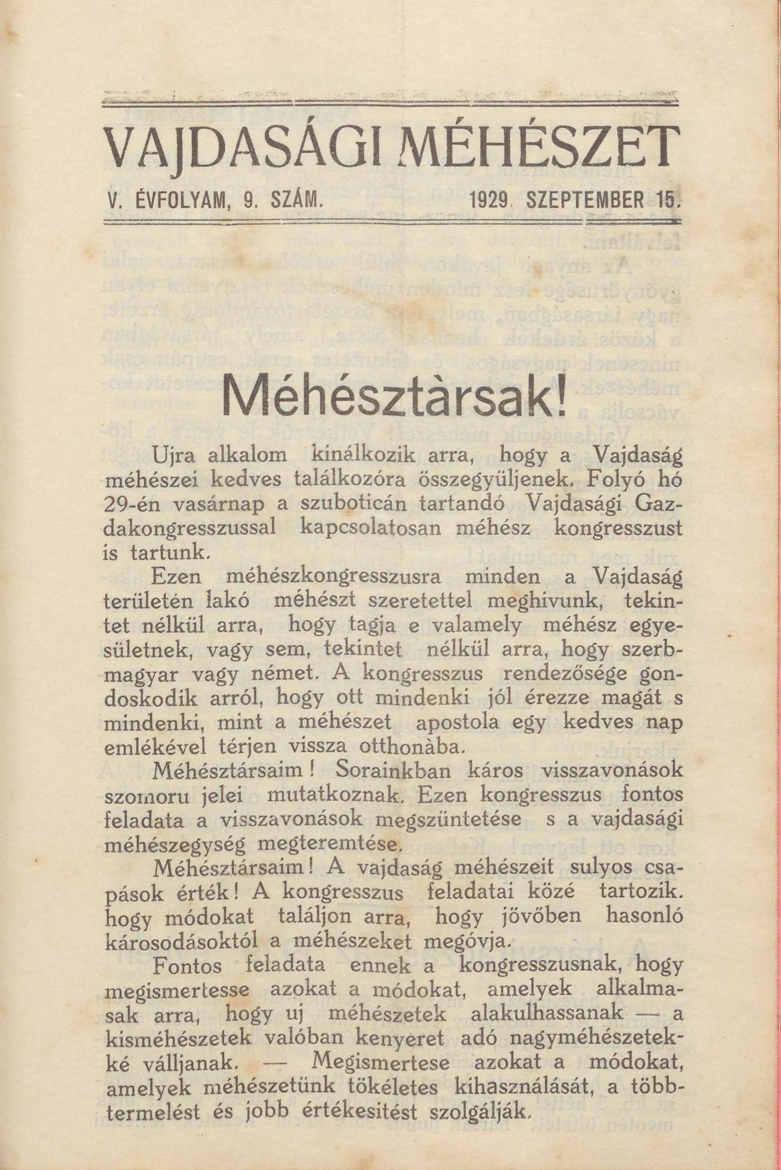 Vajdasági méhészet, 4. évf. 1929. szeptember 15. 9. sz.