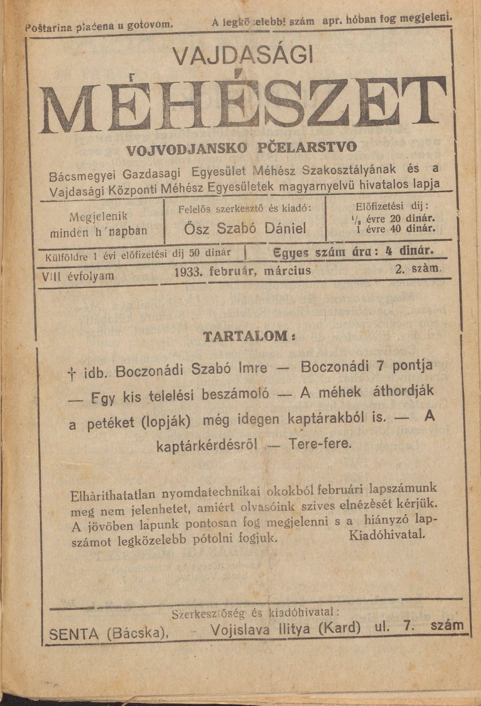Vajdasági méhészet, 8. évf. 1933. február 1. – március 1. 2. sz.