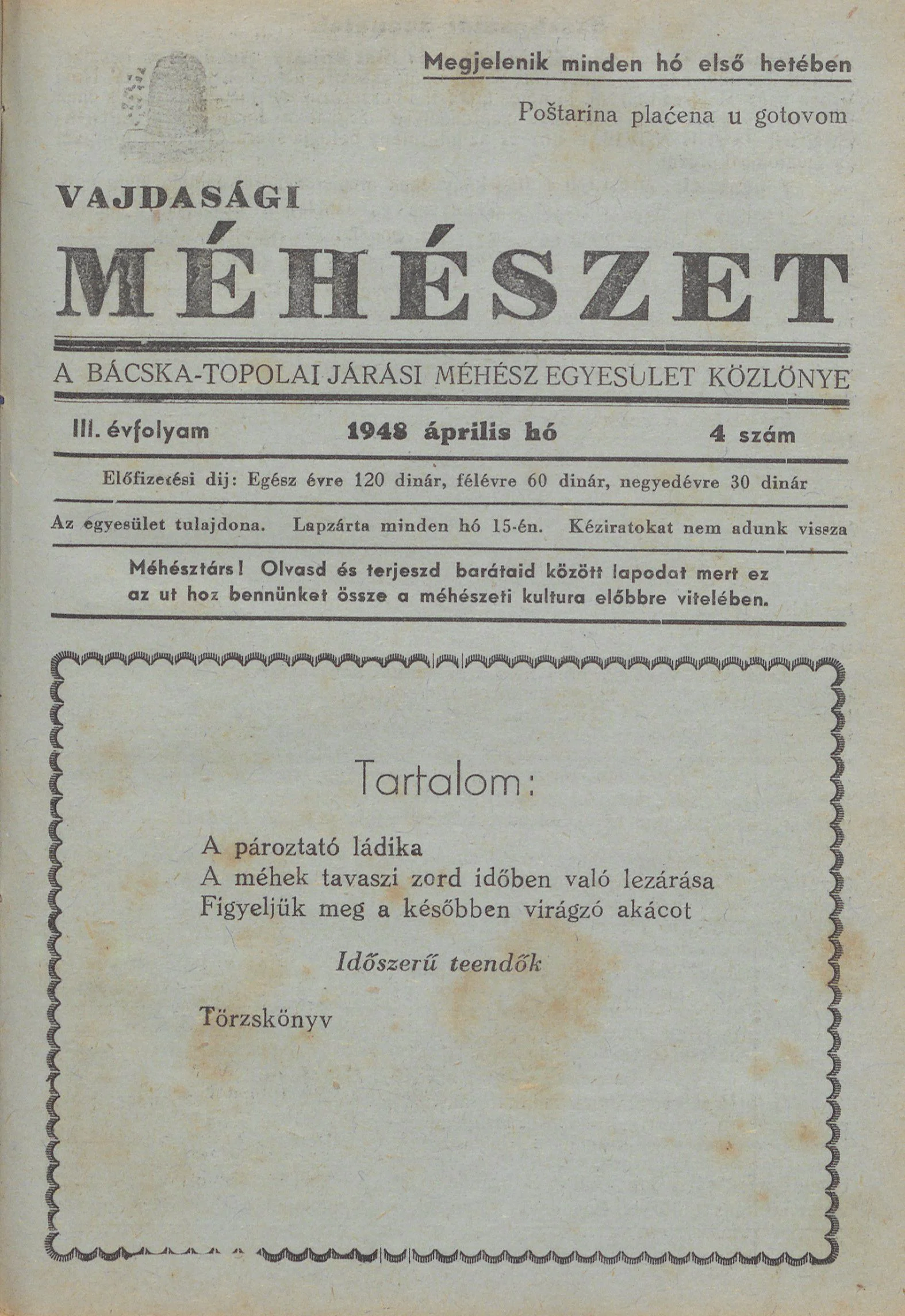 Vajdasági méhészet Bácska Topolya, 3. évf. 1948. április 1. 4. sz.