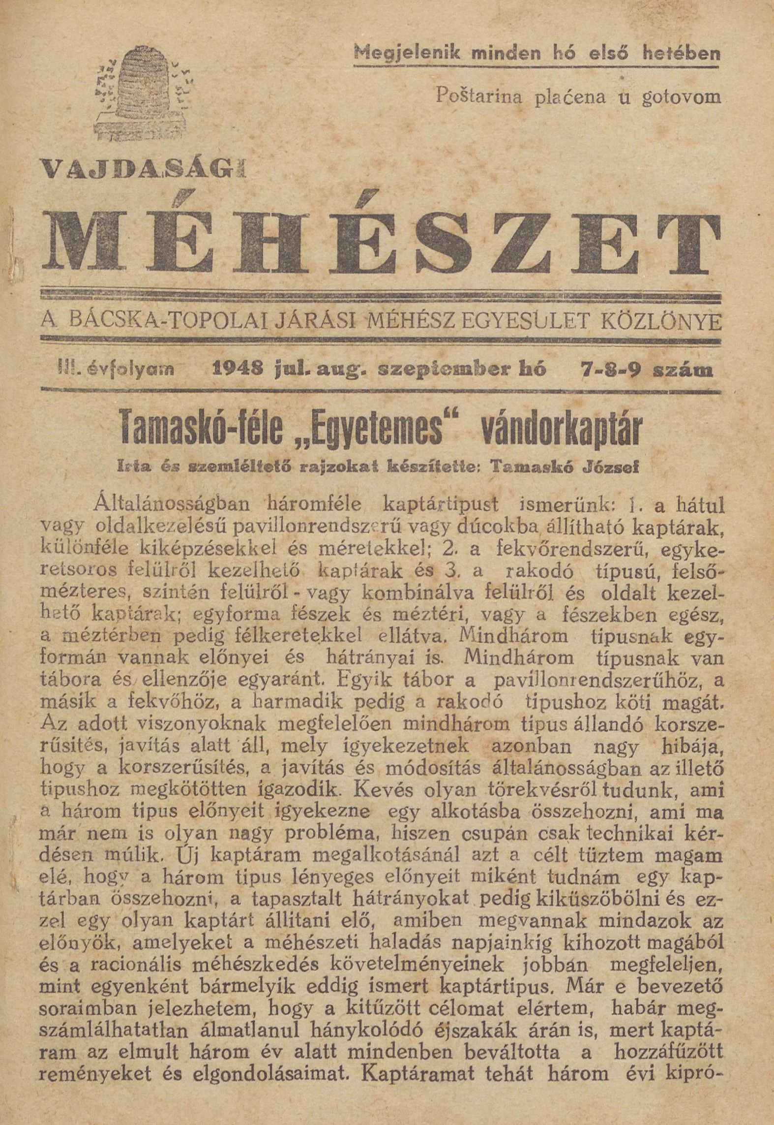 Vajdasági méhészet Bácska Topolya, 3. évf. 1948. július 1. – szeptember 1. 7–9. sz.